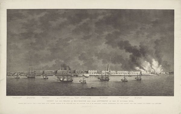 This print, made in 1830 by an anonymous artist, captures the bombardment of Antwerp. The composition is structured by the stark contrast between the detailed rendering of the ships and city. The ships are geometrically placed against the skyline of Antwerp in the background. The print employs tonal variations to create depth. Light grays define the smoke and sky, contrasting with the darker ships. The sharp lines and details used to depict the ships and buildings give the image a sense of tension and precision. This contrast creates a dynamic visual experience, drawing our eye across the scene. The anonymous nature of the artist adds another layer to its interpretation. Without a known author, the work stands as a direct historical document, emphasizing the event itself rather than an individual perspective. This lack of individual artistic expression pushes the viewer to focus on the stark realities of conflict. It is a visual account rooted in the objective depiction of a historical moment, inviting ongoing interpretation of its visual and cultural implications.