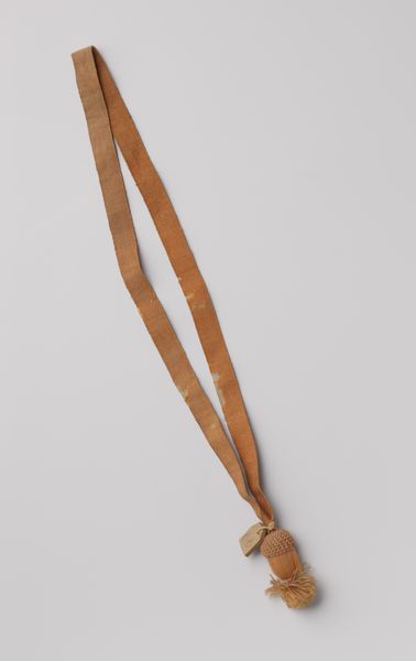 Curator: Here we have a "Etui voor degen in schede behorend bij het ambtskostuum van Dr. A.H.J. Lovink," or a scabbard case for Dr. Lovink's ceremonial sword. Made with textile and other mixed-media elements, this piece by Fa. Frans Pauwels likely dates somewhere between 1850 and 1950. Editor: You know, just glimpsing it, I felt a little like I was looking at a kind of primitive windsock, like something hopeful straining for the sky. Curator: Yes, it's intriguing to consider this scabbard beyond its mere functionality. Think about the crafting process involved. What kind of labor went into choosing the textile, sewing the seams, ensuring that it was strong enough to contain and protect a sword while also visually representing status and decorum? Editor: Absolutely, and this is not cold, machined decorum. I love the imperfections, the slight wobbles. There's something so deliberately, warmly human about this piece. I feel like there’s such dignity, perhaps in contrast to the sword, in the creation of the textile case itself. Curator: Precisely. The materials used, primarily textiles, tell a story about available resources, trade routes, and potentially even the social standing of those who created and used it. It's fascinating to consider how the economics of textile production might influence the overall design. Was the embellishment deliberately restrained because of material cost or societal restraint, or for other reasons? Editor: What I find quite appealing is how muted the whole piece is. The restrained decorative style speaks volumes, almost whispering about a period where formality reigned supreme. Did it soften the impression of Dr. Lovink somehow, by encasing a symbol of power within something so soft? Curator: An excellent observation. This blending of power and practicality reflects a very particular sensibility in art, highlighting material choices as well as the society that valued the symbolic gesture and its social display. Editor: Thinking about it makes you wonder if there are parallels in our modern, everyday objects, designed to package technology in a comforting way, like our phones, so very separate from function and impact. Thanks for untangling so much for me, material by material! Curator: It was my pleasure, the history of objects helps tell larger cultural histories and trajectories, always ripe for reimagining the narratives around them!