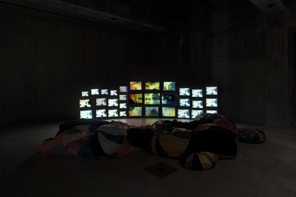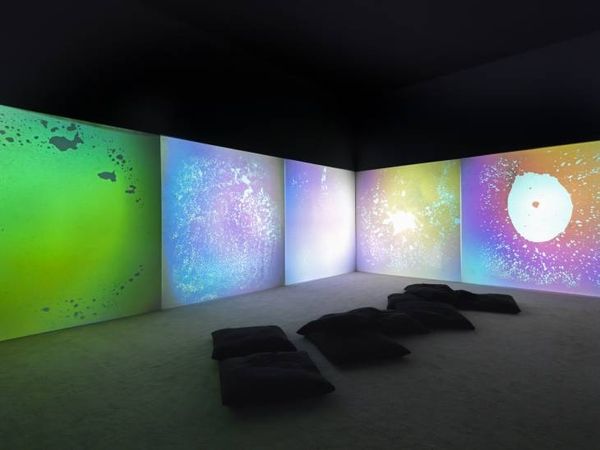 Curator: Here we have Gustav Metzger's "Liquid Crystal Environment" from the Tate Collections, a variable and durational installation of light and movement. Editor: It feels like stepping inside a lava lamp the size of a room, with the pillows inviting you to just melt into the experience. What's the story here? Curator: Metzger was interested in how technology shapes our experience. These ever-shifting projections, created using heated liquid crystals, were intended as a commentary on impermanence and change. Editor: I get a sense of unease, too, though. The constant flux makes it difficult to find something to latch onto, almost like information overload, you know? Curator: Absolutely. Metzger saw destruction as an inherent part of creation, reflecting on the socio-political upheavals of his time. Editor: The installation is a powerful, immersive reflection on how we perceive change. I am curious how viewers experience the work differently each time. Curator: Indeed, and that's part of Metzger's legacy. A dynamic installation prompts us to confront the transient nature of our world.