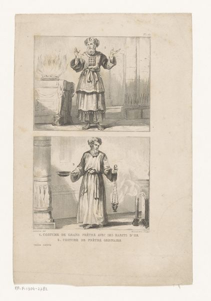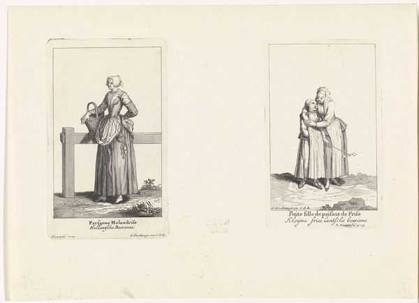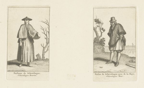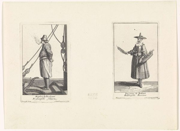 Curator: This engraving by Bernard Picart, dating to 1728, is titled "Amsterdamse visboer en Amsterdams viswijf," which translates to "Amsterdam Fishmonger and Amsterdam Fishwife." It currently resides in the Rijksmuseum. Editor: My initial impression is one of austere dignity, despite its seemingly commonplace subject matter. There’s a crisp, almost brittle quality to the lines, especially in rendering their clothing. Curator: Absolutely, and considering Picart was French but worked extensively in the Netherlands, it’s intriguing to explore how his cultural lens may have shaped these representations. Do these portrayals challenge or reinforce existing stereotypes around gendered labor? What narratives are left out of this image, for example the perspective of someone from a lower economic background? Editor: The medium itself, engraving, is key. Each line etched into the plate demands intention and control. We can appreciate the engraver’s skill in translating the textures of their garments - the woman’s layered skirt compared to the man's looser tunic. And consider how those etched lines themselves stand in for the labor, not only in its rendering, but its execution. This process emphasizes the physical effort involved in creation and evokes the labor of those being represented. Curator: Exactly, and through a feminist lens, one might see the positioning of the woman, with her cloth, hinting at domestic duties intertwined with her trade. While the man presents with open pockets suggesting transactions and power, the woman holds something related to keeping clean fish or a potential sales instrument that speaks of the tools of the fish trade, linking labor, gender, and visibility within the public sphere. Editor: This pairing also prompts us to think about distribution networks. The visual language suggests established hierarchies – are we looking at primary sellers versus secondary ones? I mean, what is being consumed and traded here? And whose stories are being visualized or commodified through this engraving? The artist would profit from this image by those wishing to learn about the clothing or to collect images that define professions from Amsterdam's culture and market. Curator: I agree; through our different perspectives, it allows us to excavate stories and questions that broaden its historical context within an intersectional social landscape. Editor: Precisely. Examining the piece from a materials-and-production standpoint helps contextualize its original intent, giving modern audiences additional interpretations regarding production value and what makes this art from labor so impressive.