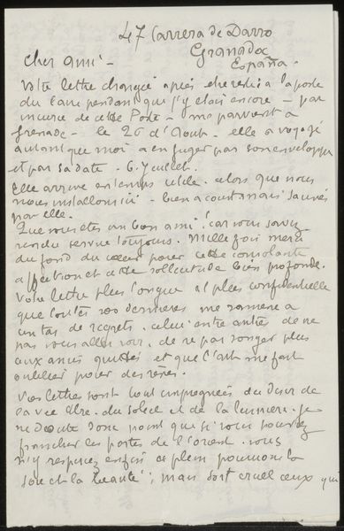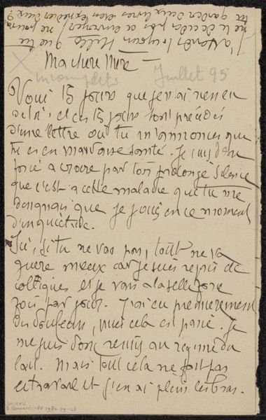 Editor: This is "Brief aan Andries Bonger," a letter from Émile Bernard to Andries Bonger, created before 1897, using ink on paper. It’s surprisingly intimate seeing an artist's handwriting… almost like peering into their thoughts. What's your take on it? Curator: You’ve touched upon the key to this piece: intimacy. It's a portal into Bernard's mind. Think of this scrawling ink, this frantic energy—not just as a letter, but as an outpouring of emotion, almost a raw nerve exposed on paper. Notice the frantic strokes... Can you sense the urgency? It hints at the turbulence within him at the time. Editor: Absolutely, it's not calm and collected. So what was happening with him around 1897? Curator: Ah, there’s the rub! By this point, Bernard’s relationship with figures like Gauguin had become fraught. There were intense arguments over artistic innovation and recognition. Seeing the frenetic pace and emotional weight of the handwriting offers an entry point into these issues. One senses the artistic uncertainty alongside personal troubles. Does it shift your understanding seeing it as almost a cry for understanding? Editor: Definitely. It goes beyond just words. It becomes a visual representation of his emotional state. I didn’t realize so much could be communicated through something as simple as a letter. Curator: Precisely! And that, my dear student, is why even a personal letter can become a window into art history—a brushstroke of the soul, if you will.