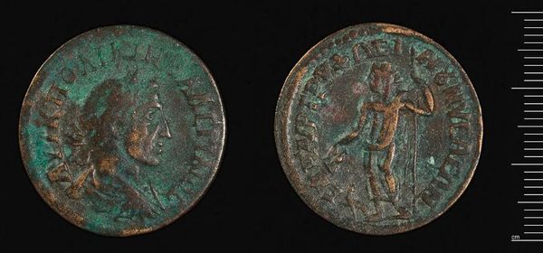 Curator: This is a Follis of Licinius I, struck in Siscia. What strikes you about it? Editor: Its patinated surface gives it a sombre, almost ghostly mood, highlighting the decay of power. Curator: Note the detailed portrait of Licinius, the careful rendering of his features, and the lettering—observe how they contribute to the coin's overall design and readability. Editor: But what about the figure of Jupiter on the reverse? It’s not just design, but ideology. Licinius used Jupiter to legitimize his rule in a time of religious and political strife. Curator: Indeed, the figure placement creates a balanced composition. Editor: It's a powerful statement of imperial authority in miniature form, underscoring the intersection of power, religion, and art. Curator: A confluence well worth considering.