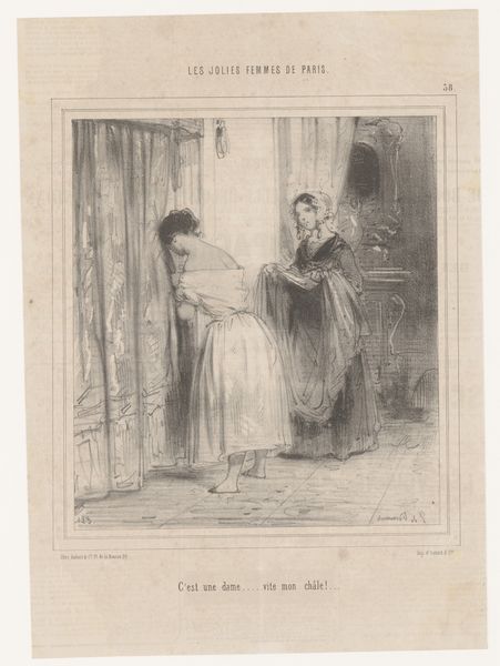 Curator: So here we have "Seated, sadly gazing man next to standing woman" from somewhere between 1830 and 1880. This drawing resides here at the Rijksmuseum, and we know it came from the hand of Adolphe Mouilleron. It’s done in ink on paper. Editor: My first thought is how utterly Victorian it feels. That quiet melancholy is almost a tangible thing, hanging in the air between those two figures. You can almost feel the scratch of the pen across the paper, too. Curator: Absolutely, there's a raw immediacy in Mouilleron's mark-making that speaks directly to Romanticism’s fascination with feeling. It looks like he’s favored delicate strokes and hatching for creating the tonal variations to establish the drama. What do you make of the woman’s stance? Editor: Her stance looks as though she may well be offering some kind of… comfort? Or maybe she’s delivering bad news, the kind that’s landed like a stone in the man's stomach. The texture of her dress, all those tiny folds and gathers, almost seems to weigh her down, matching the heavy mood. The man is wearing some really ornate decorative materials. Is he upper class? Curator: Her costume has a certain "homemade" feel, while the man's does suggest status, or at least aspiration. The social dynamic intrigues me, and yes I suspect that the male may indeed be an aristocrat of some kind. Considering the time it was produced, I see class anxieties lurking in the composition. Think about the availability of paper at the time. This was pre-mass production. The paper is just as much a statement of wealth. It certainly lends a layer of fragility to this tableau, don't you think? Editor: I think so. It's intriguing how the choice of a relatively permanent material—ink—captures such a fleeting, painful moment. As though the artist is trying to pin it down and really trap the subjects! Curator: A snapshot of sorrow rendered with beautiful simplicity. Editor: Exactly. A fragile little poem about fleeting moments. I'll keep this image in my mind's eye, and imagine this piece exhibited with art that I'm sure must also evoke the fragility and anxieties you highlight so effectively.