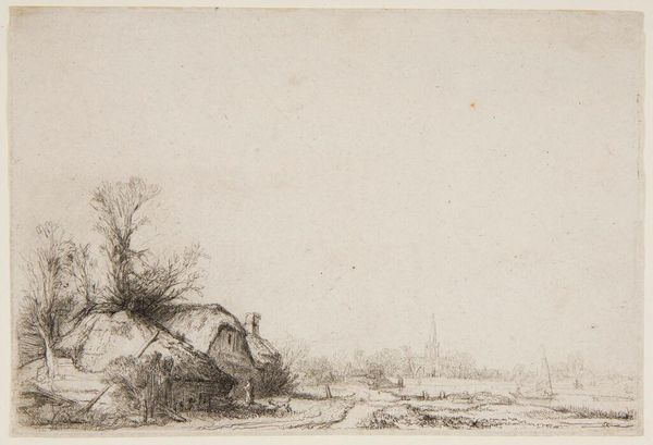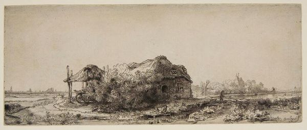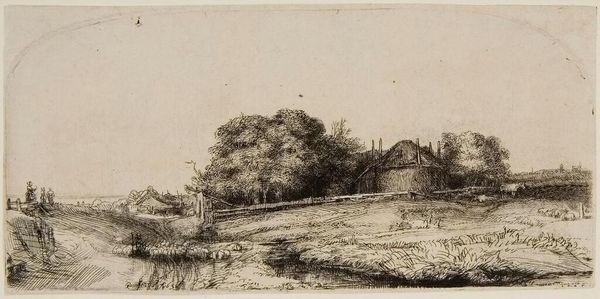 Curator: Here we have Rembrandt van Rijn's "Landscape with a Cow Drinking." This etching, of modest size, captures a rural scene. Editor: It has a quiet charm. The cow, the water, the suggestion of a village—a bucolic moment rendered with delicate lines. But what does this tranquility conceal? Curator: Consider the Dutch Golden Age. Rembrandt's landscapes weren't mere depictions, they were statements. Land ownership, trade, and the rise of a mercantile class all shaped how the Dutch saw themselves in relation to the landscape. Editor: So, this cow, drinking peacefully, becomes a symbol of Dutch prosperity built on exploited lands and perhaps, unequal labor? The pastoral ideal, then, is more complex. Curator: Exactly. It’s a constructed image, reflecting both the beauty and the underlying social realities of the time. Editor: It challenges us to look beyond the surface, to question the narratives of idyllic life. Curator: A reminder that even seemingly simple images can hold layers of meaning.