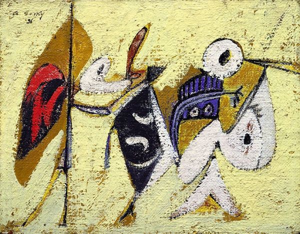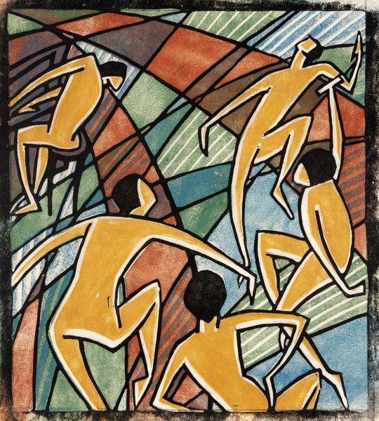 Curator: What a fascinating piece. This is "Wings," a woodcut print created in 1928 by the Australian artist Dorrit Black. Editor: Striking, isn't it? The geometric forms immediately grab you. The bold lines and flat planes of color are so stylized, yet they capture a sense of movement and energy. Curator: Exactly. Black studied modern art techniques in Paris, and that modernist influence is clear. You see it in the way she reduces the figures to their essential shapes. But beyond its aesthetic appeal, consider the print medium itself: the labor-intensive process of carving the woodblock and the multiple impressions it allows. This brings fine art closer to mass production. Editor: That's interesting. Looking at the composition, the dynamism is undeniable. The figures seem almost suspended between earth and sky, reinforced by the diagonals created by the limbs and birds, contrasting with the solid block of colour of what is possibly a harbour. How do you read that spatial ambiguity? Curator: Perhaps as a reflection of a society in flux, a generation caught between tradition and modernity, work and leisure. These could easily be everyday people. I’m also intrigued by Black's choice to present a coastal landscape. What narratives are constructed and imposed, and by who? Editor: I can see how one can connect those meanings to Black’s work, though I see it as less critical, and more aligned to formal artistic concerns such as the tension between figuration and abstraction. Those stark, angular figures against the somewhat softer shapes in the background play a great formal game in my view. Curator: A fascinating perspective! It highlights how deeply formalism is ingrained in our visual thinking. I like how Black challenges us to consider the connections between the aesthetic and the social. What purpose does that art really serve? Editor: Indeed. “Wings” is a reminder that artistic meaning lies at the intersection of process, form, and, perhaps even a little against the artist's primary intent, socio-economic factors. Curator: It’s an important discussion. Let’s carry it on with our next work, shall we?