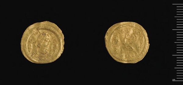 Curator: Here we have a gold Solidus, dating back to the reign of Emperor Anastasios I in Constantinople. Editor: It’s incredible how much detail they managed to pack onto such a small surface—it feels dense, almost claustrophobic. Curator: The composition is deliberately iconic. On one side, we see the idealized portrait of Anastasios, rigidly frontal, framed by inscriptions. The reverse depicts Victory, holding a long cross. Editor: The material itself speaks volumes. Gold wasn't just valuable, it was malleable, durable. The minting process, the labor involved—it all contributed to the coin's power as a symbol of imperial reach and economic control. Curator: Precisely. And the strict visual language, the controlled symmetry... all reinforced the authority of the emperor. It’s a carefully constructed image. Editor: Agreed. But let’s also consider the practical function: circulating through markets, touching countless hands. It’s a material testament to a vast, interconnected world. Curator: It serves as a powerful reminder that even the smallest object can carry immense significance. Editor: Absolutely. And that sometimes, the real value lies not just in what an object represents, but in how it was made and used.