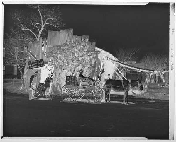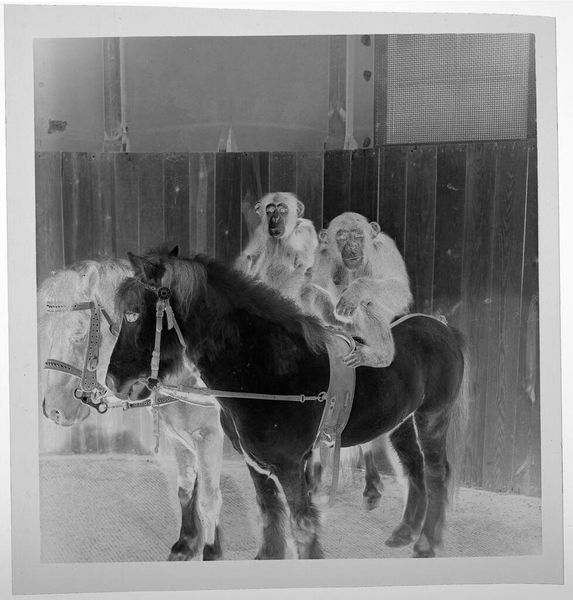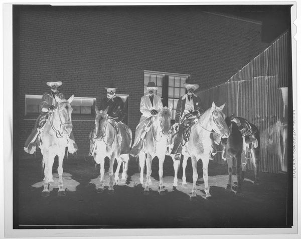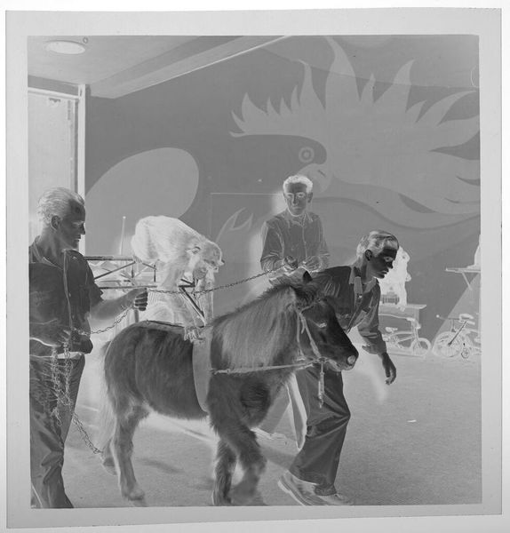 Editor: So, this is an untitled photograph by Harry Annas, showing a man and a young boy on horses. The inverted tones create a stark, almost dreamlike quality. What compositional elements stand out to you? Curator: The inversion certainly challenges our perception. I'm drawn to the interplay of light and shadow, which emphasizes the textural details – the horses' coats, the foliage. Note how the artist uses the linear elements of the road and trees to create depth, drawing the eye into the composition. Editor: It's interesting how the textures pop out. I didn't notice that at first. Curator: Indeed. The photograph is a study in contrasts, isn't it? The smooth curves of the horses against the rough texture of the trees... Editor: Absolutely, I see that now. Curator: It is often fruitful to consider the formal elements before moving towards contextual analysis. Editor: That’s a good reminder; thanks for pointing out those structural details.