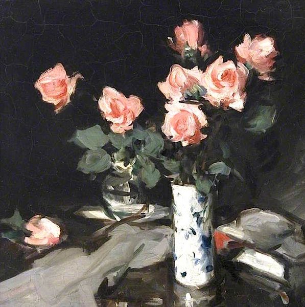 Konstantin Korovin made 'Roses', with oil on canvas, sometime around 1912, and it feels like he had a great time doing it. The painting’s all about a really playful approach to mark making, full of daubs and dashes of color, that build up the image piece by piece. Up close, you can almost feel the texture of the paint, thick and creamy in some spots, thinner and more transparent in others. Look at the way he layers those strokes to create the roses, how the pinks and reds swirl together with touches of white and green. It's like he's not just painting roses, but also painting the experience of seeing them, the light shimmering, the colors blending. There's a really dark patch of ultramarine shadow under the vase that almost feels like a counterpoint to the sweetness of the flowers, and brings a kind of depth to the whole piece. It all puts me in mind of Manet, or maybe even some of the early Fauves, how they were pushing the boundaries of color and form to capture a feeling, not just a picture. It’s this ongoing conversation between artists, each one building on what came before.