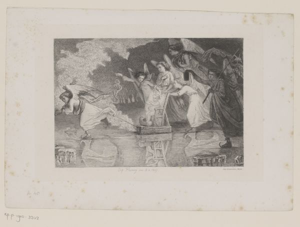 Editor: This is an albumen print from between 1880 and 1890 by Giacomo Brogi depicting a fresco of Bacchus and Ariadne from the Domus Vettiorum in Pompeii. I am struck by the fragmented composition, with its visible cracks running through the fresco. What can you tell me about its visual language? Curator: Indeed. The fractured surface plane immediately commands attention, drawing our focus to the materiality of the artwork itself. Observe how the artist captures the scene – note the use of light and shadow within the depicted fresco. How do those formal qualities impact the distribution of value and our comprehension of form? Editor: It’s almost as if the cracks add another layer to the scene. They both obscure and highlight the figures of Bacchus and Ariadne, contrasting the fleeting, captured moment with an implied narrative of time. What about the use of faded color? It is monochrome with muted browns and creams. Curator: Precisely! That restricted palette directs us to analyze relationships and distinctions solely through tonality and value. Notice also how, despite the wear and age evident in the image, Brogi manages to effectively convey the fresco's composition and the narrative scene. Do you observe how certain figures stand out more due to greater tonal range, or through more vivid execution in design or in application of contrast in the values used in representing forms? Editor: Now that you point it out, the interplay of light and shadow sculpts the figures and directs our eye to follow certain contours more intentionally. Are there any other prominent structural elements at play within this visual layering? Curator: Certainly, there is value in recognizing the strategic construction of the composition, how Bacchus’ form contrasts against Ariadne to underscore the story represented. Considering what we have examined regarding value and use of dark against light as compositional strategies, what effect would a change in any value across the painting have on its stability? Editor: I hadn't thought of that. Changing a value would shift the eye and likely detract from its current focal points. Curator: Just so! In closing, reflecting on how the work uses light, shadow, and tone has given both of us a deeper insight into the power of monochromatic forms and pictorial elements as strategies to focus attention within a work. Editor: That’s right. Thanks for expanding my perspective and providing a greater appreciation for form!