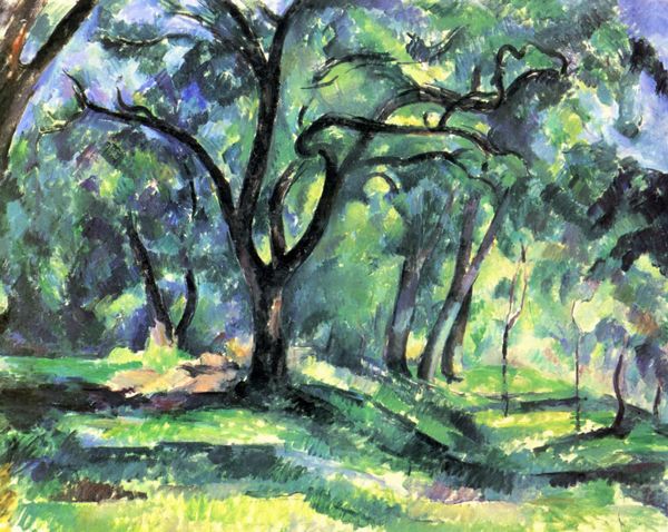Curator: My first impression? A peaceful hush. It’s a feeling, almost a scent of pine and damp earth rising off the canvas. Editor: We're looking at Paul Cézanne’s "In the Forest," painted in 1899. It's a post-impressionist oil painting, done, rather fittingly, en plein-air. Curator: That's it. Feels like a memory, not quite real. Like squinting into dappled light on a sweltering summer afternoon. Those fractured greens and browns. Makes you feel you're looking up into it through thick glass, yeah? Editor: The composition is striking. Note how Cézanne uses those monumental rocks in the foreground as anchors, pulling our gaze back into the density of the trees. It’s less about accurate representation, and more about the interplay of form and color to suggest depth and volume. See how those blues act like structural vectors to keep our eye traveling back, and up? Curator: Totally, right? The solidity of those rocks contrasted against the way those strokes almost dissolve into light near the top is neat. What if we interpreted these looming crags, as I intuitively want, as representing looming memories? Editor: Tempting, but let’s try to resist overtly psychological interpretations for now. The subject matter is traditional—a forest landscape. The innovation lies in Cézanne's technique. Look closely; those short, parallel brushstrokes, those planes of color defining form, are prefiguring Cubism. And consider the absence of a single, fixed vanishing point... Curator: Fixed anything was the enemy! It wasn’t how the light, and shadows hit those trees, but rather how those elements struck something, some feeling inside him. Some truth in that moment. Editor: But what is that “truth” detached from a systematic formal analysis? Curator: Okay, Mr. "Systematic"! Still, something very powerful in his willingness to paint what he sees and, especially, *feels* and leave some blank canvas! It feels incomplete...which, if you think of it is how one might think of many old beautiful trees; here to stand watch far after us. Editor: I find myself appreciating anew the ways Cézanne's "In the Forest" continues to challenge our notions of perception. Curator: I know right! I will forever hear secrets whispering from this landscape of soul.