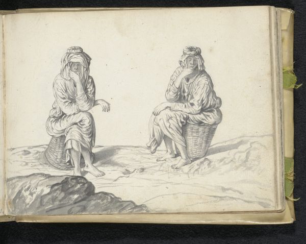 Curator: Esaias Boursse’s pencil drawing, “Two men,” from 1662, offers us a glimpse into Dutch Golden Age figuration. Editor: Striking. The subdued palette creates an almost ethereal feel. The composition, two figures starkly separated, hints at a narrative tension. Curator: Boursse, though often overlooked, operated within a vibrant artistic and economic milieu. His drawings, including this one, were commodities, produced within a specific network of patronage and artistic exchange. How do you read their garments? Editor: The clothing, though sketched with economical lines, suggests a sort of classical draping combined with what appears to be everyday wear, creating an intriguing contrast. I would suggest focusing on how the rendering affects perception: how it suggests character and dignity of ordinary figures. Curator: Indeed. The seeming contradiction makes them stand out, yes? Consider the availability and cost of materials during the Dutch Golden Age. Pencil, paper, and the labor-hours dedicated to the piece… these were investments. Editor: Investments that resulted in balanced asymmetry! The angles of their stances, mirroring yet offsetting each other, create a subtle visual harmony despite the spareness of the drawing. The rendering offers us information about line, volume, space… Curator: It seems crucial to recognize that Boursse's "Two Men," wasn't made in a vacuum, of course. The artist would have worked through a network, with apprentices, the paper produced by mills… the final image isn't just an aesthetic statement, but an index of its creation and consumption. Editor: Yet, despite its place in commerce, look at the emotion it triggers. Despite not being traditional painting, this piece resonates deeply, offering a moment of contemplative grace through deceptively simple lines. Curator: Understood! By studying these figures, as sketched using Boursse’s technique of his era, we can understand how drawings reflect both formal skill and societal norms of labour, of production. Editor: Well, whatever one may believe the intention of the artist was, both our interpretations only enrich the piece with multiple facets to view it under, creating an individual and more complex perspective overall.