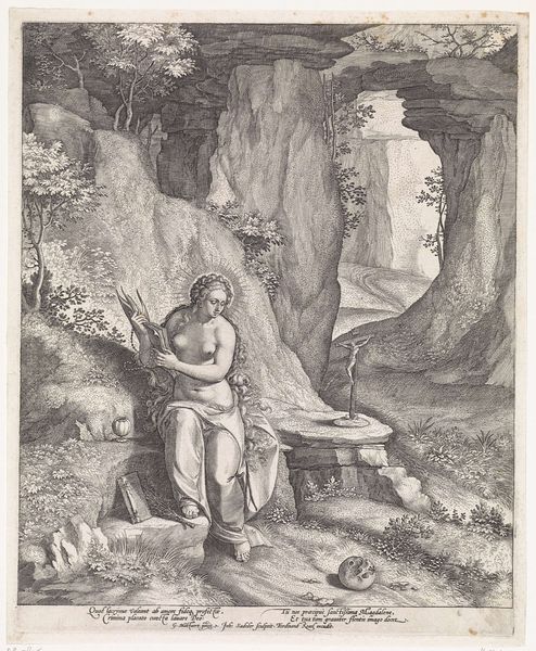 Editor: Johann Sadeler I created this print, Magdalen Penitent, sometime between 1550 and 1601. The figure is compelling, but the landscape seems to dominate the composition. What do you make of the relationship between figure and setting? Curator: The interplay between the figure and the setting establishes a profound visual dichotomy. Observe how the stark linearity of the rocks contrasts with the curves in the Magdalen's body. Editor: I see that now; it emphasizes her humanity. Curator: Precisely. Note the artist's use of light and shadow to articulate form, guiding the viewer's eye and creating a symbolic language. The skull at her feet, for instance, signals mortality. The whole composition invites us to reflect on the structural elements employed to convey meaning. Editor: This close reading really illuminates the artist's choices. Curator: Indeed. By examining these formal aspects, we gain a deeper understanding of the artist's intention and the artwork's intrinsic value.