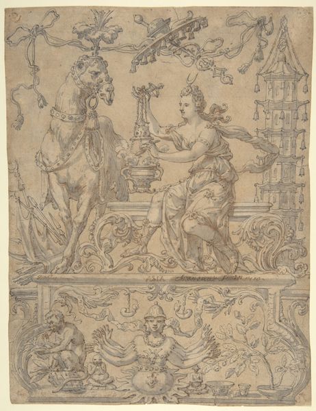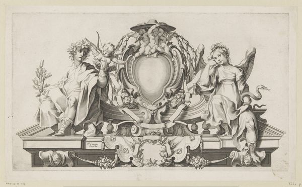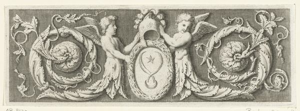 Editor: This is *Horizontal Panel with Two Medallions Containing Cupid*, an engraving by Floris Balthasarsz van Berckenrode from between 1596 and 1652. I find the composition, with its circular frames and symmetrical arrangement, surprisingly intimate despite the somewhat mythological subject matter. What captures your imagination most about this print? Curator: Ah, a delicate dance of ink and imagination! I am particularly drawn to the contrast between the classical imagery, like the Cupids, and the almost domestic feel evoked by the portraits. Notice how the artist uses line weight to create depth, even in such a small scale. Do you feel that it exudes playfulness? Almost mischievous in its understated grandeur? It reminds me of a whispered secret. Editor: I see what you mean about the playfulness. I hadn't quite noticed the level of detail in the lines themselves. It's incredibly intricate for something so small! The mischievousness, perhaps, is from cupid? I didn't focus on how each 'portrait' has a cupid and they are mirror images almost in each circle! Why combine cupids with the women? Curator: It’s about LOVE, isn’t it? And what *is* love? Is it only familial, between a mother and child, as we see on the left, a portrait within a portrait, a visual echo? Or is it the love of bounty, as depicted on the right with the figure and what appears to be harvested wheat or other natural offerings? Perhaps it's about LOVE found and LOVE in nature? These are rhetorical, you understand, but the artist would hope for us to wonder, wouldn't they? To pause and, quite literally, consider the lines before us! Editor: That’s a fascinating perspective – considering the dual aspects of love. I initially saw it as just another classical image, but you’ve completely shifted my view. It's more nuanced and reflective than I initially thought. Curator: Art, at its best, is a mirror reflecting our own ever-changing perspectives, isn't it? I am certain the artist, were they able, would find immense joy in the contemplation it inspires, across time and space.