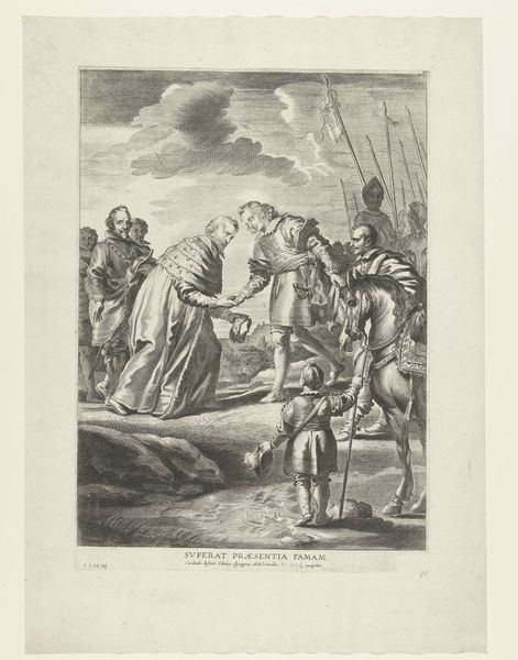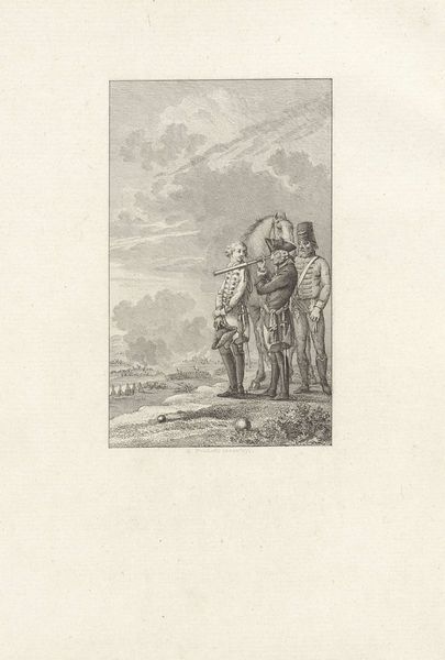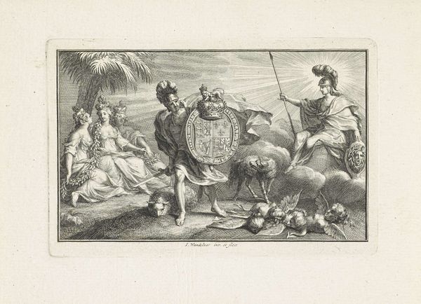 Editor: We are looking at "Heldhaftige soldaat uit het leger van Caesar," or "Heroic Soldier from Caesar's Army," an engraving by Ludwig Gottlieb Portman from 1801. There's such drama in this print! What immediately grabs me is the action; a soldier riding an elephant with… a clear agenda. What’s your take on this, knowing the period and the artist? Curator: Oh, it's quite a scene, isn't it? This piece throws us headfirst into the theatrics of neoclassicism. Portman really dials up the drama! For me, this work speaks volumes about how the late 18th and early 19th centuries reimagined antiquity. It's like they’re saying, "Let’s crank up the volume on everything!" What do you think is Portman trying to convey to us here, besides the sheer spectacle? Editor: Hmmm… maybe it's a commentary on power? I mean, you have this soldier on top of an elephant, clearly dominating the battlefield. And it is a reminder of the grand narratives artists pursued back then. Curator: Absolutely. But notice, the "heroism" is a little... over the top, wouldn't you say? It’s that exaggeration, that almost performative display of strength. Think of the times – Napoleon was strutting across Europe, and everyone wanted to capture the “glory” of conquest. I almost wonder if Portman is subtly critiquing that thirst for grandeur through the very act of portraying it. Am I being too cynical? Editor: Not at all, it makes you think. I guess the point isn't necessarily historical accuracy, but the construction of a heroic image. Looking closer now, you're right - there's a theatricality to it all that maybe even pokes fun at these grand narratives. That had not occurred to me at first! Curator: Exactly! Sometimes the loudest proclamations mask the most profound doubts, doesn't it? It reminds us to look beyond the surface, especially when dealing with historical portrayals of heroism. This old print sure keeps revealing interesting ideas, I could talk about it for hours... Editor: Me too! This definitely gives me a lot to think about concerning historical narratives and their potential hidden critiques. It has been eye-opening!