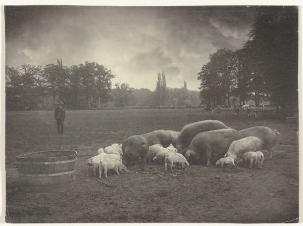 Curator: This photograph, taken by Woodhead Studio in 1906, is titled "Defectives, Epileptics: United States. Massachusetts. Palmer. State Hospital for Epileptics: 1906. Sheep in pasture." Editor: The composition is striking. The muted sepia tones lend a melancholic air, and the texture of the sheep's wool seems almost palpable. Curator: Indeed, the image carries a heavy weight when viewed through the lens of its historical context. The sheep in the pasture offer a seemingly bucolic scene, yet the title reveals its connection to a stigmatized population within the Palmer State Hospital. Editor: The contrast is jarring. It evokes questions about the gaze—the photographer's, the institution's, and now our own. There is a tension between the aesthetic and the deeply unsettling. Curator: Precisely. It prompts us to consider the power dynamics at play and how the act of photographing can both document and perpetuate social inequalities. Editor: It's an effective reminder that beauty can often mask a darker truth.
