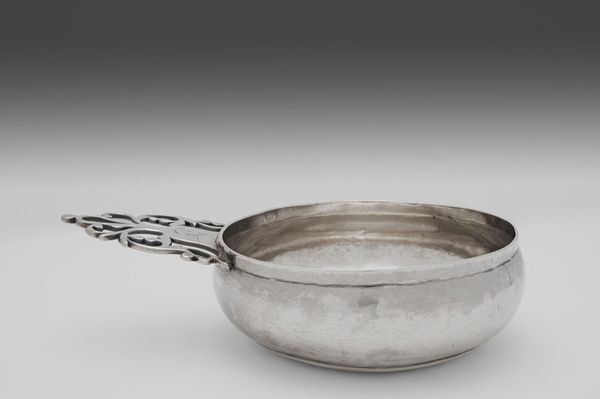 Editor: Here we have a porringer by Paul Revere. It’s crafted from silver and, honestly, it’s giving me serious colonial vibes! I'm curious, what stories do you think this piece holds? Curator: Oh, this little bowl is practically whispering tales of hearth and home! Look at the hammered texture, not perfectly smooth, but reflecting light in a very human way. And that ornate handle, almost like a tiny crown. It feels precious, doesn't it? Editor: It does! Curator: Imagine, it’s probably held everything from a child’s first gruel to warm brandy for a chilly evening. I wonder who W.T.B. was, whose initials are on the handle? What thoughts did they have while holding it? Food for thought, eh? Editor: Absolutely! Now I can’t help but think about what it held and who held it. Thank you.