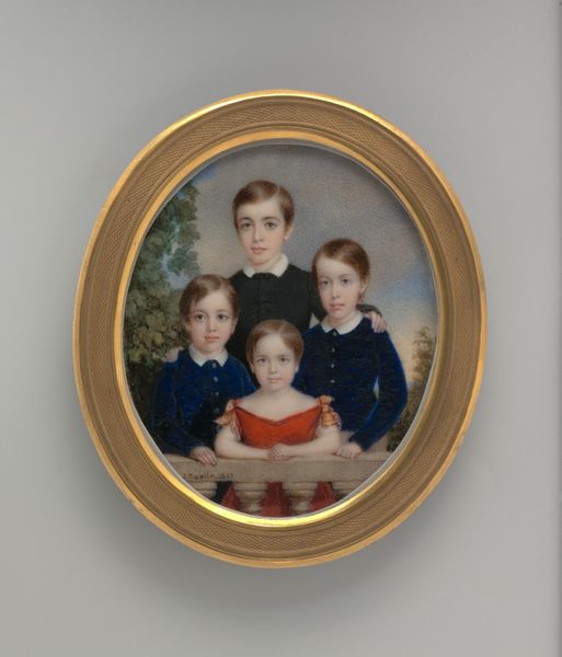 Sturtevant Hamblin painted this portrait on canvas entitled "The Younger Generation," though we don't know when it was created. The three children are formally arranged, their static poses and direct gazes creating a sense of austere self-possession. Hamblin’s composition, with its emphasis on symmetry and repeated forms, speaks to a deeper structure. Note how the artist uses color and shape. The blue dresses of the sisters, echoed in the younger brother’s coat, create a visual rhythm that ties the figures together, while the book and tools act as symbolic markers of knowledge and craft. The slight variations in the children’s faces invite a semiotic interpretation, the formal portrait's function to convey status and identity. The artwork challenges fixed notions of childhood innocence, instead presenting a carefully constructed image of order and decorum. “The Younger Generation” is not simply a representation of three children; it's a canvas for exploring cultural values and the performance of identity.