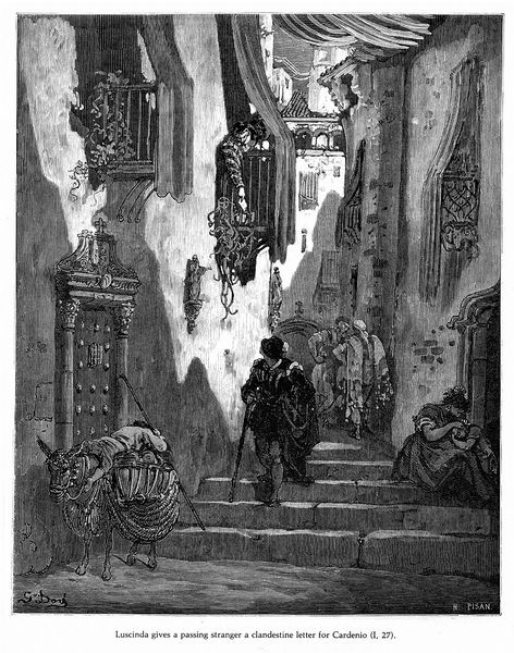 Gustave Doré created this illustration for an edition of Cervantes’ "Don Quixote" during the 19th century, a period marked by European colonial expansion and a fascination with the ‘Orient.’ The scene depicts a woman leaving with her father, framed by Moorish architecture, hinting at the historical and cultural complexities of Spain, marked by centuries of Islamic presence. Doré, a French artist, was working within a tradition of European Orientalism, where the ‘East’ was often romanticized or exoticized. Consider how this image might reflect or challenge the identity of the people who historically lived in these spaces? How might the woman in the image be interpreted as a figure caught between cultures, her departure charged with the weight of cultural and personal loss? Doré's illustration invites us to reflect on the historical narratives that shape our understanding of identity, culture, and place.