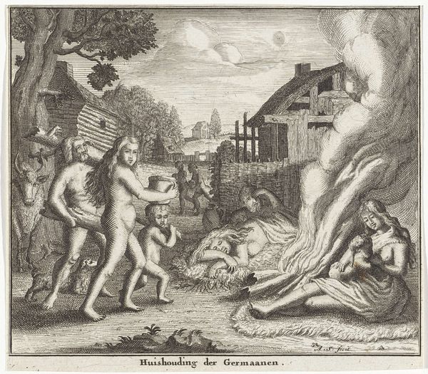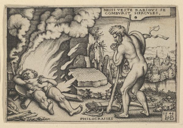 Curator: This print, "Death of Hercules" by Sebald Beham, presents a stark scene. The tonal range achieved through the engraving technique is remarkable. Editor: The composition is dominated by the implied diagonal of Hercules' expiring body—the flames mirroring the tension of his pose. A powerful statement. Curator: Beham, active in the 16th century, often used prints to disseminate classical narratives. The means of production here allowed wider access to these stories. Editor: The contrast between the detailed rendering of Hercules' form and the more stylized landscape creates a fascinating visual imbalance. Curator: Consider the labor involved in producing these multiple impressions—each one spreading not just the image, but also the ideology it carries. Editor: The engraving captures a pivotal moment, a transition between mortal and immortal. The linearity evokes a sense of fateful destiny. Curator: Indeed, this print prompts us to consider how materials shape and reflect cultural values, reaching viewers across time. Editor: The intensity of the scene and Beham's command of line and form leave a lasting impact, prompting a deep reflection on mortality.