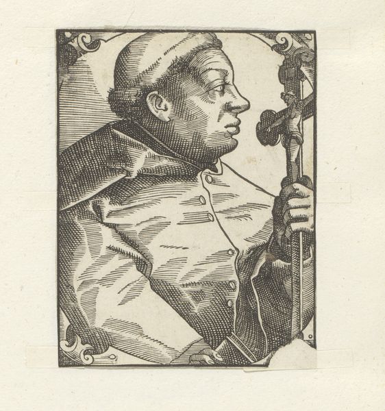 Editor: Here we have Daniel Hopfer’s "Portrait of Martin Luther," made in 1523. It’s an engraving, so lines and details are really emphasized, creating a strong likeness. What stands out is its almost stark quality – not just Luther's serious expression, but the very process used to create it. What's your perspective on this engraving? Curator: I'm drawn to the printmaking process itself. Engravings like this were crucial for disseminating images and, importantly, ideas, in the Reformation. The very act of reproduction using these technologies highlights labor and consumption, enabling Luther's image to circulate widely and influence public opinion. This engraving challenges established views on what's "high art." The medium and process, from the engraver's labor to distribution and reception, matter just as much, if not more, than any individual artistic genius. Editor: So you're saying that the material circumstances and the act of making copies become part of the artwork’s meaning? It becomes almost more of a printed object than an artistic expression of one. Curator: Precisely. The creation of multiple copies collapses traditional art historical focus on single object authenticity. Consider who controlled the means of production. Was this an independent project? Or was it commissioned and funded? Also, who would have purchased and distributed these prints? Asking those questions situates the portrait within broader economic and social networks of the time. How do the class dynamics shape your understanding of the image? Editor: That’s fascinating. Looking at it as a manufactured object changes my understanding quite a bit. It encourages one to analyze both subject and object and what those things communicate about the era that created the print and sustained the Reformation. Curator: Right. Examining materiality and the production process sheds new light on this portrait. Editor: Thanks! This has really broadened my thinking. Now I want to know who commissioned and who consumed it.