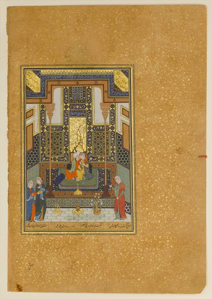 This painting, "Bahram Gur in the Turquoise Palace on Wednesday," comes from a manuscript of the Khamsa, or Quintet, of Nizami of Ganja. Likely created in the 15th century, the image gives visual form to the writings of the 12th-century Persian poet Nizami. The painting illustrates a scene of courtly life, complete with musicians and attendants. The opulent setting reflects the values of the royal or aristocratic patron who commissioned the manuscript. The image evokes a sense of idealized beauty and harmony. The painting speaks to the cultural and intellectual life of its time, reflecting the importance of literature, poetry, and the visual arts. To understand this work more fully, scholars consult historical texts, architectural drawings, and patterns, along with related examples of Islamic painting and decorative art. These resources help us to understand the social context that shaped its production and meaning.