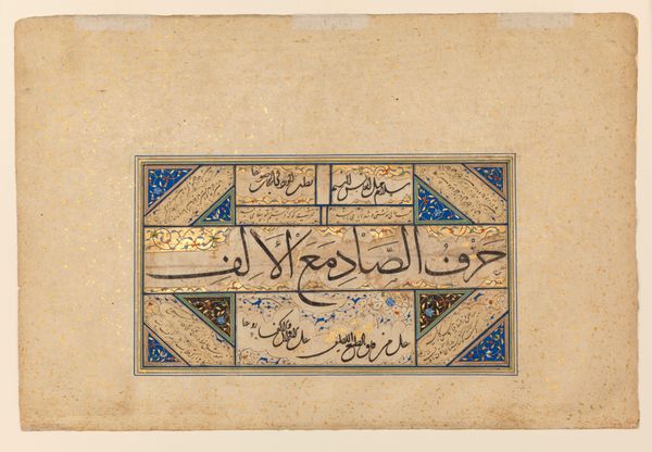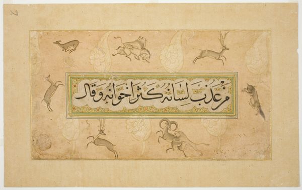 Curator: This is a page of calligraphy in ornamental style created between 1843 and 1893, attributed to Malik Muhammad Qazvini. It's rendered in ink on paper. What strikes you first? Editor: The density of the line! It almost feels architectural. The black ink creates such a powerful contrast against the parchment-like background, defining these organic yet strangely rigid forms. Curator: Indeed, the formal elements are compelling. But consider its socio-cultural role: as Islamic art, calligraphy held immense significance. It wasn’t just decorative; it was a sacred act, often used to transcribe verses from the Quran, democratizing access through portable artworks. Editor: I see that. The density does lead the eye across the whole picture plane. Look at how the artist uses those small floral-like elements to give the letters visual balance; notice that subtle elongation to direct your focus on the implicit geometric structures in it. Curator: The inscription's function served within social, and perhaps religious spaces. Displaying pieces such as these, made art a conduit to power within domestic settings. These framed pieces become tools. Editor: I agree on the level of visual interest. However, the placement, within a framed setting adds another dimension, doesn’t it? The multiple frames layered, directing the reader through that single black border. It emphasizes the central structure by calling back its visual cues with varying line weight. Curator: That resonates! As you observe, the varying lines of the black frame lead into the center. A domestic sacred space becomes defined through an individual's expression of cultural capital and a commitment to certain philosophical foundations. Editor: The dynamism of that black calligraphy against the negative space is very arresting and brings me back to the pure form that anchors so much historical meaning. Curator: And I appreciate the opportunity to consider how faith and artistic intention meet to transform domestic spaces and reflect personal connections with culture and spirituality.