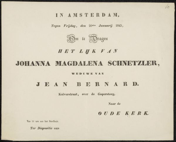 Hendrik Vieroot made this invitation to the funeral of Theodorus van Schelluynen in Amsterdam, 1776. As a printed announcement, its dominant symbols are textual, carefully arranged to convey solemnity and respect. The typography itself becomes a symbolic language. Notice how the name "Theodorus van Schelluynen" is prominently displayed, anchoring the visual composition, drawing focus to the individual, a motif seen across millennia in funerary art. This act of naming echoes ancient Egyptian practices of inscribing names on sarcophagi, ensuring the deceased's identity endures. The mention of him as 'Bedienaar des Godlyken Woords'- minister of the word of God- is also quite prominent. Consider the emotional weight this announcement carries. The careful selection of font evokes a sense of dignity and tradition, reflecting a collective memory of mourning rituals that bind communities together. This simple announcement taps into the subconscious awareness of mortality and the enduring human need to commemorate and remember. The announcement is cyclical, death and remembrance following each other into perpetuity.