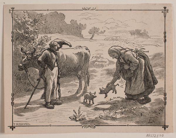 Curator: Before us hangs Charles Jacque's "Little Milkmaids," an etching from 1864 currently residing here at the Metropolitan Museum of Art. It offers an intriguing window into rural life, wouldn’t you agree? Editor: It absolutely does! There's something quite melancholy about it, don't you think? A sort of pensive stillness. The soft grays and whites enhance that mood—almost like a faded memory. It's pastoral, but not idyllic in that idealized way. Curator: Precisely. The "Little Milkmaids" can be examined through the lens of genre painting, but also intersects with the emerging Realist movement. It's important to recognize that Jacque, while sentimental, sought to portray the labor of rural women with a degree of unvarnished authenticity during a time when rural labor was heavily romanticized. Editor: Yes, the stoicism is so present. Look at the girl standing—the folds of her clothing, her gaze fixed downwards. It's not romantic—it’s simply life as it is, imbued with a subtle dignity. What is she thinking about? Is she tired? And then, the other young girl. She seems totally absorbed by something happening on the ground. Curator: It's the contrast between the standing girl and the girl on the ground that is fascinating. The one is burdened by expectations of womanhood while the other remains for a moment yet carefree, though soon to be similarly situated in her duties and social limitations. The scene speaks to a particular class status, visible even in their clothing, don’t you see? Editor: Oh, absolutely. But to me it speaks also of timeless bonds of sisterhood, almost, and an apprenticeship of the mundane. There’s a tenderness there too—they are both rooted in nature and each other’s company, so it also radiates peace. Curator: This makes the symbolism quite dense with interpretive layers. We see a representation of labor, an illustration of a life largely unchanged for centuries, and the dawning recognition of gendered and class expectations. Editor: This piece invites the quiet observer to look into their world, into their dreams and concerns, no? For me it triggers my nostalgia, like I am one of those grazing cows… lost in this gentle, beautiful past. Curator: A world and moment defined by both beauty and its limitations. It is pieces such as this that help us understand that past as deeply intersectional. Editor: Beautifully said.