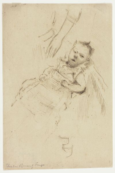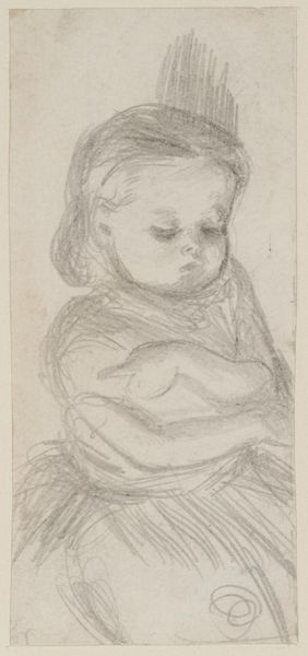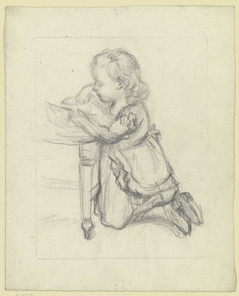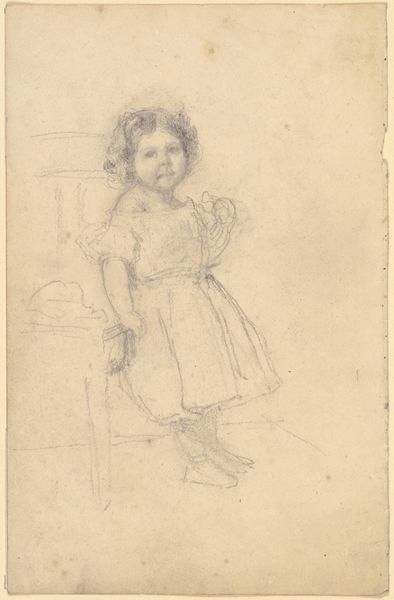 Otto Scholderer drew this sketch of a ‘Sitting Little Girl’ with graphite on paper. The texture is soft, created with delicate lines that define the girl's form, from her curly hair to the folds of her dress. The composition emphasizes the child’s pose, with Scholderer using a network of fine strokes to capture a sense of weight and volume, creating a visual rhythm that guides the eye across the figure. The girl's gaze directs our attention, engaging us in her quiet moment. The empty space around her becomes a field of potential, highlighting the artwork's structure. The sketch engages with the formal qualities of line and tone to evoke depth and presence. This artwork functions as an exploration of form and human expression. It invites us to look closely at the interplay between the artist's hand and the subject's essence.