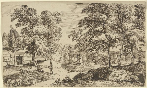 Editor: This is Willem de Heusch's "Landschap met een tekenaar," or "Landscape with a Draftsman," made before 1690. It’s a pen drawing, and the detail achieved with just the pen work is really striking. What's your take on this piece? Curator: For me, it is all about the process. Look at how the landscape becomes both subject and object, the very stuff of art and the environment of its creation collapsing in on one another. Here's an artist within the artwork making art itself, thus self-consciously showing his labour, making the process overt. Where do we see other evidence of labor here? Editor: Well, there’s incredible detail, suggesting painstaking hours. Also, doesn’t the fact that it's a drawing—a medium often considered preparatory— rather than a finished painting also point to an emphasis on the act of creating? Curator: Precisely. And think about the paper itself, its source, its cost in the 17th century. The social context and the means of artistic production meet and speak of materiality as paramount. Consider the consumption implied: who would have been this artwork's consumer? Why such painstaking detail, if it were just a study? Editor: Perhaps it was intended for a collector who appreciated skill and process as much as the final image? Or maybe for personal enjoyment and reflection? It makes me think differently about drawings I’ve seen; what I thought was simple becomes rich with labor. Curator: Yes, this focus on labor and materiality shifts our understanding from just *what* is depicted to *how* and *why* it was made. And that shift informs how we see all art from this era. Editor: I see what you mean. Thinking about the context of production really opens up new ways of understanding the artwork.