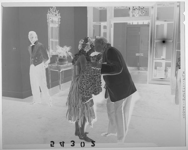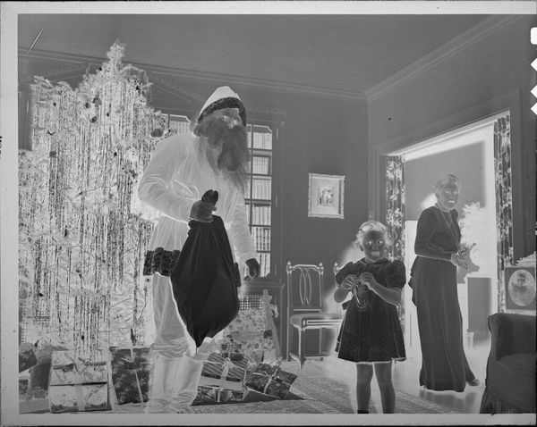 Editor: This is an untitled photograph by John Deusing of Santa talking to a little girl. It's quite small, only about 4x5 inches, and the grayscale gives it a nostalgic mood. What strikes you most about this image? Curator: The seeming innocence is striking, but I question the power dynamics at play. Santa, traditionally a symbol of generosity, here occupies a position of authority. Consider the societal construction of childhood innocence versus the commercial exploitation inherent in Santa's role. How does this image reinforce or challenge those power structures? Editor: I hadn’t thought about it that way. It's interesting to consider Santa not just as a gift-giver, but as a figure of authority within a capitalist system. Curator: Precisely. And by capturing this interaction, Deusing prompts us to question the larger cultural narratives we often take for granted. We must consider whose interests are served by perpetuating this image. Editor: I see. It is much more complex than I first thought. Thank you!