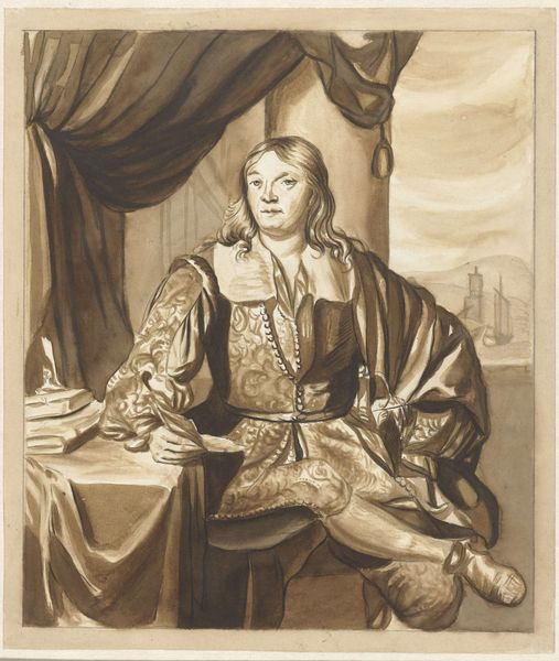 Caspar Netscher created this monochromatic drawing, *Portret van Cornelis de Man*, sometime in the 17th century. The Dutch Golden Age saw an explosion of portraiture, reflecting the values of a mercantile society where individual success and status were celebrated. Yet, this portrait offers a quieter narrative. Cornelis de Man, adorned in a flowing robe and lace collar, exudes an air of relaxed confidence, characteristic of the Dutch elites of his time. His gaze, though direct, carries a hint of introspection. Netscher, who spent formative years in the Hague, became known for intimate, domestic scenes that frequently involved women. Here, though, he presents a male sitter who subtly challenges traditional representations of masculinity. The flowing lines of Cornelis’s robe and hair soften his image, suggesting a man of intellect and refinement rather than overt power. In doing so, Netscher offers a glimpse into the shifting identities of the period. This drawing, with its delicate washes and subtle nuances, serves as a reminder of the complex interplay between identity, representation, and societal expectations.