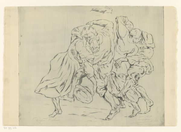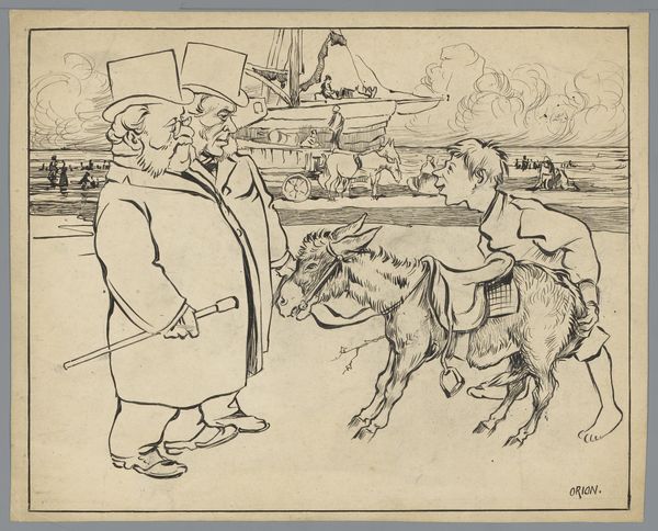 Curator: This is a satirical lithograph, likely from before 1898, titled "Spotprent op de kieswet van Johannes Tak van Poortvliet," which translates to "Cartoon on the election law of Johannes Tak van Poortvliet." It’s currently held at the Rijksmuseum. Editor: Immediately, I’m struck by the stark contrast in the lines and textures. The piece feels dense, agitated almost. Look at the rough hatching in the lower left. It speaks to me of urgency and the raw production involved. Curator: Indeed. Van Hoytema, the artist, was known for his detailed depictions of nature, but he also dabbled in political satire. The use of lithography allowed for mass production, making this a potent piece of political commentary for the time. The title clearly indicates its socio-political focus. Editor: Right, the lithographic process is critical here. It means accessible art, reaching a wider audience than an oil painting ever could. This isn't just decoration; it's meant to stir public sentiment and debate the value of labor and cost that entails. What statements were considered modern back then. Curator: Exactly. The context is the failed electoral reform proposed by Johannes Tak van Poortvliet. Each dog in the image represents a different political faction or figure involved in the debate, their names are even inscribed in the dog collars! It's a direct visual representation of the political landscape at the time. Editor: Note how Van Hoytema chose pen and ink – a readily available and cost-effective medium. And those dog collars, emblazoned with the faction names, become almost like branding. Its about manipulating the production itself. Curator: A keen observation! It highlights the role of imagery in shaping public opinion during a time of significant political change. You know, with each dog pulling and snarling it's a very direct and effective statement. Editor: Van Hoytema understood the material language. By emphasizing mass reproduction and employing simple techniques, he amplifies his social message far beyond any gallery wall. This is art as direct action. Curator: Ultimately, this print exemplifies the power of art as a tool for social and political engagement, allowing everyday citizens to confront and interpret the critical issues of their time. Editor: Precisely. And by understanding its method and reach we recognize the broader societal impact of this kind of art—challenging its audience through both image and process.