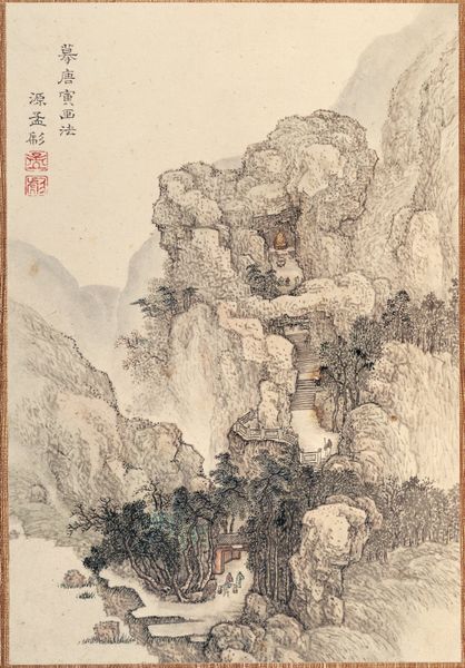 Curator: This piece is titled "Album Leaf" by Wang Chen, created around 1774. It’s an ink drawing on paper, part of the collection here at the Minneapolis Institute of Art. Editor: The first thing that strikes me is how much this landscape pulls you in. There’s a winding path leading up into what looks like a village nestled amongst the mountains. The monochrome palette adds to its quiet, almost dreamlike quality. Curator: Wang Chen was a celebrated artist during the Qing Dynasty, and this work really exemplifies the scholarly tradition of landscape painting. It’s not just about depicting a real place, but also conveying a sense of harmony and order within the universe, reflecting Confucian ideals that were strongly favored at the imperial court. Editor: Right. It's loaded with symbolic elements. Mountains, in Chinese art, traditionally represent stability and the emperor's power. The water flowing suggests wealth and its constant movement. I can also see tiny figures in the scene—what's their purpose? Curator: Those figures serve multiple functions. On the surface they serve as a contrast to the vastness of nature. Philosophically, they are reminders of our connection with the natural world; they highlight our place within the cosmos and a gentle hint to the need to reflect, observe and contemplate the self within all this greatness. More practically, in art-historical terms, they emphasize scale and spatial depth to the pictorial space. Editor: You know, looking closer, I find something melancholic. Despite the beauty and the apparent harmony, the ink strokes are quick and deliberate. Perhaps it reflects the artist's own feelings or some commentary on the era. Curator: That's an interesting perspective, particularly given the Qianlong Emperor's ambition to oversee the most prosperous period of the Qing Dynasty and maintain absolute power. We need to appreciate, however, that these works were frequently commissioned to reaffirm those ideological commitments of empire, creating spaces of retreat where power could be consolidated. Editor: I suppose, either way, "Album Leaf" stands as both a beautiful composition and a poignant visual document from the late 18th century. Curator: Indeed. And analyzing Wang Chen's work in light of its patronage reveals so much about artistic production under state influence, the projection of imperial power, and even the expression of individual agency within an institutional context.