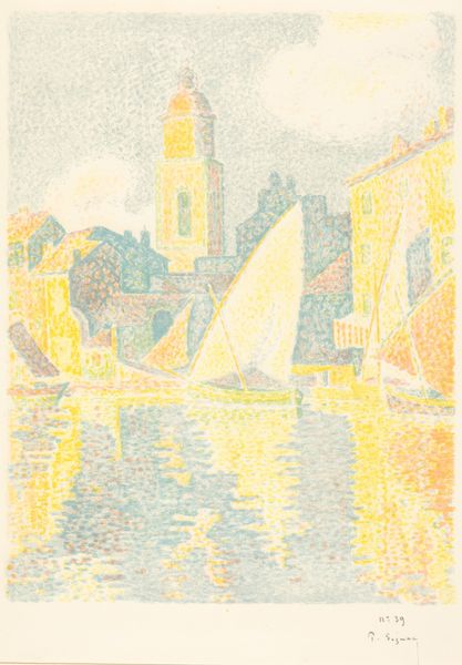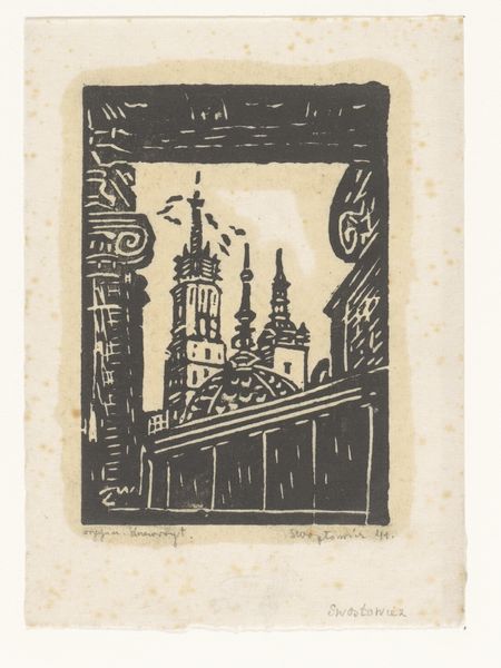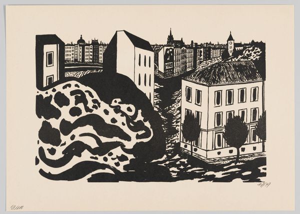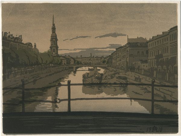 Curator: What strikes me immediately is the mood. There's a sense of quietude, a kind of muted harmony despite the urban scene. Editor: Yes, it does have a calming effect. We are looking at "Sukiya Bridge", a woodblock print created in 1945 by Unichi Hiratsuka. It's currently held at the Rijksmuseum. For a scene of a bustling city, it feels incredibly still, even contemplative. But let's consider that 1945 was a pivotal year – what social and political influences do you think were at play during the time of its creation? Curator: That’s precisely what makes it compelling. Bridges, in art, are frequently potent symbols; connecting one place with another, implying passage or change. This piece seems to subvert that somewhat. There's this quietness, this feeling of stillness that resonates powerfully against the backdrop of post-war reality. I can't help but consider the bridge, this architectural marvel that signifies continuity and connection, as reflecting an urge for a return to equilibrium. There’s almost a melancholic air. Editor: Exactly. The city reflected here also suggests much about post-war society. Although this isn't a traditional Ukiyo-e print due to the artist's influence from other artistic forms, like western art movements, Hiratsuka uses this lens to represent Japan's changing urban landscape, while the details reflect socio-economic issues, alluding to the lives of the working class. Note, for example, how his chosen perspectives and colors play into that theme. Curator: The choice of limited color palette, almost monochromatic save for the golden washes, gives it this slightly subdued effect that contributes to the emotional tone. As for the shapes, one notices an almost geometric regularity of architectural details, as well as in how the water ripples – which brings about feelings of stability but also limitation. This feels like something deeper than merely aesthetic preferences. What cultural memories is Hiratsuka evoking here? Editor: That leads into a critical reflection about representation itself. Which perspectives does Hiratsuka consciously emphasize and how does this shape our reading of the cultural identity he projects? Whose stories and realities are deemed visible within this serene urban landscape, and, inevitably, whose stories remain out of sight? By focusing on the geometric while including organic shapes in smaller but vital proportions, such as the outline of trees along the buildings, it could even hint at what we may refer to as "Japanese Identity" from a post-war standpoint, one marked with tradition but looking toward the future. Curator: The piece, through its calm visual vocabulary, urges viewers to reflect on that fragile moment, both in terms of individual and cultural identity. What a fascinating window into a specific, culturally loaded moment in history. Editor: Precisely, and analyzing art in its own social and historical context is indispensable to gaining that very comprehension. What seems like a charming landscape harbors layers of nuanced narratives and societal weight.