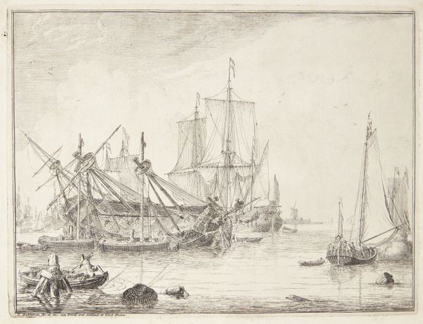 Editor: Here we have Jan van Goyen's "Auf einem Fluss viele Fischerbote, rechts ein Dorf," or "On a River, Many Fishing Boats, a Village to the Right," from 1655, rendered in ink, chalk and Indian ink. It feels… understated, almost like a fleeting moment captured in monochrome. What stands out to you? Curator: It strikes me how this drawing encapsulates the relationship between the Dutch Republic and its waterways during the Golden Age. How do you perceive the role of the boats in relation to the village? Editor: Well, the boats definitely seem central to the scene, bustling with activity, while the village sits more distantly, almost passively, in the background. It's like the river is the lifeblood connecting everything. Curator: Precisely. Van Goyen, along with many of his contemporaries, recognized the crucial role rivers and canals played in the economic and social fabric of the Netherlands. Consider how the government invested heavily in infrastructure like canals to facilitate trade. Do you see any visual clues of that interplay here? Editor: Perhaps the number of boats and the detailed depiction of their rigging points to their importance? There's also a sense of depth created, emphasizing the vastness of the river system extending into the heart of the village, I guess. Curator: Absolutely. The composition directs our gaze from the foreground activity towards the village, reinforcing the link between maritime activity and urban life. Think about how paintings and drawings like this were often commissioned or acquired by the rising merchant class. Editor: So, in a way, it's a celebration of Dutch maritime power and prosperity during that period? Curator: I’d say this artwork normalises maritime economic success by documenting it for local viewership. The choice of such ordinary materials emphasizes everyday access to art in this society. This also allows for a direct connection to art in the average 17th century Dutch setting. Editor: I hadn't considered that before – thank you! Curator: My pleasure. Art and its place within culture is more closely intertwined than we often perceive.