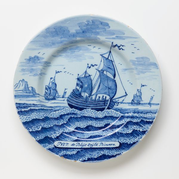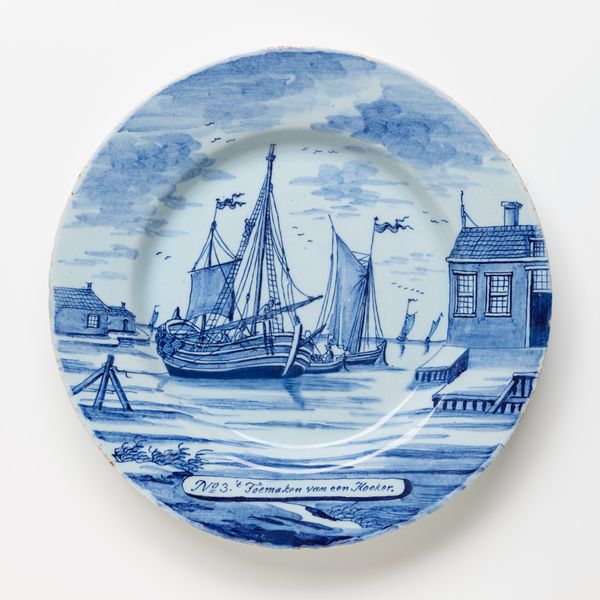 This is Plate No. 12, made by the Porcelain Axe Factory in Delft, its date of production unknown. The plate presents a monochromatic tableau of daily life, depicting two figures mending fishing nets. The choice to depict such a scene speaks volumes. It suggests an audience deeply connected to maritime trades and their stories. Are the figures laboring, content or burdened? There is an inherent dignity to the representation of labor that invites us to consider the value and the human cost of industry. Consider, too, the broader context of Delftware production. Dutch Delftware became popular as a cheaper alternative to Chinese porcelain during a time of increased trade and global exchange. In this context, the plate becomes more than just a decorative object. It is a canvas that reflects economic shifts, cultural aspirations, and perhaps, the quiet resilience of ordinary people whose lives were deeply intertwined with the rhythms of the sea.
