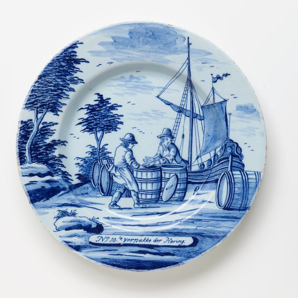 This series of twelve plates is painted with scenes related to fishing for herring. While undistinguished in appearance, this silver fish was an abundant source of food in the North Sea and supported a vast fishing industry in the Netherlands. Herring fishing accounted for such a large percentage of the wealth of the Dutch Republic that Amsterdam was said to have been built on herring bones.