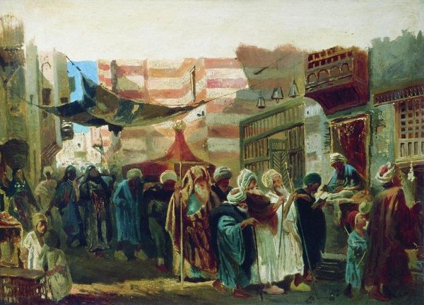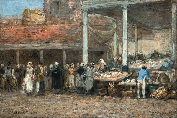 Curator: At first glance, it’s the busyness that strikes me. It's bustling, yet subdued—the ochre palette makes everything feel a little hushed. Editor: Indeed. We are viewing “Brussels - the Old Fish Market,” a captivating oil on canvas possibly realized around the year 1871, by Eugène Boudin. The composition leverages a striking foreground, with figures arrayed beneath a covered marketplace. The rendering echoes elements of both Impressionism and Realism. Curator: Impressionism for sure; it is all light and fleeting gestures. See how the people are suggested, not delineated. They become almost part of the marketplace itself, their forms dissolving into the broader spectacle of trade and daily life. Boudin does this in a remarkably original way. I am intrigued by that juxtaposition, especially, how space and movement become subjects of a painterly language. Editor: The canvas certainly privileges the pictorial field. Boudin is very invested in the relationships of tone, texture, and form here, but there's also the distinct subject, of a fish market, suggesting Realism’s interest in scenes of contemporary life. Notice how the geometry of the covered market establishes depth while modulating light, structuring a zone within the vibrant clamor that the crowd projects. Curator: Do you think Boudin consciously positioned his architecture as a counterpoint? To frame the everyday rituals enacted within the market? The lines are solid; they give the whole a structured impression which I did not expect. And the contrast makes for a lively field. Editor: Precisely. The architectural framework allows Boudin to organize chaos—transforming an essentially messy marketplace into a site for artistic meditation on color, light, and, notably, human activity. Curator: It seems a moment arrested. Which of course, makes one wonder about the broader story outside that frame: who are these people, and what stories do they have? Boudin grants just enough reality that my imagination is piqued, which might be its appeal, really. Editor: Right. This image serves both as an objective document and subjective experience. Reflecting upon this composition I believe the pictorial strategy reflects how modernity and tradition mix, each modifying and affirming the presence of the other. Curator: Yes, I think you have really pinned something down about that mixture of experiences which makes the painting sing for me as well. Editor: It has been a productive look, as always, at how visual structure can unlock unexpected meaning and connections.