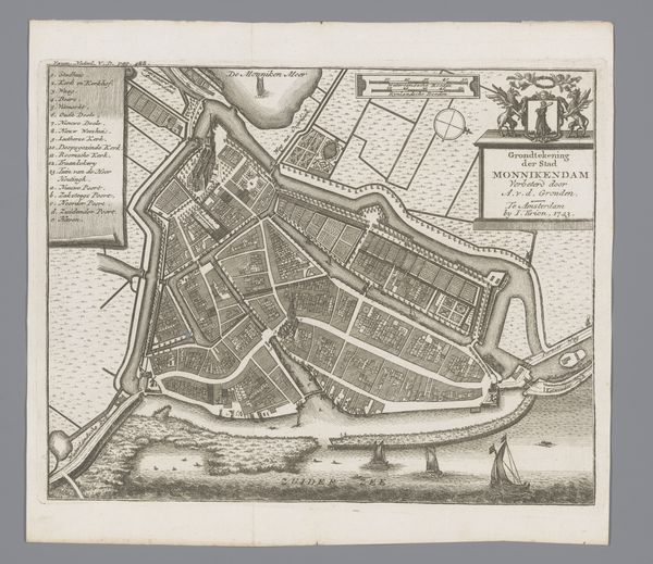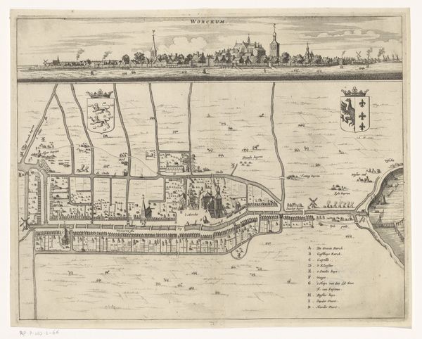 This is Jacob van Meurs's 'Plattegrond van Stavoren met stadsgezicht', an etching showing a bird's-eye view of the Dutch city of Stavoren. Observe the heraldic symbols adorning the upper corners, emblems of power and civic identity, mirroring similar insignias found across Europe on city gates and royal decrees. The lion, a recurrent motif, embodies courage and vigilance, echoing its ancient roots in Mesopotamian art and mythology. This symbol reappears across time—from medieval tapestries to modern-day national flags—each instance imbued with layers of cultural memory. The act of mapping itself taps into a primal need to impose order upon the world, to chart the unknown. This cartographic impulse, driven by a desire to understand and control, connects us to ancient mariners navigating by constellations and Renaissance explorers charting new territories. Such symbols engage our subconscious, evoking collective memories and primal fears associated with boundaries and exploration. The city, secure within its walls, projects an aura of safety and prosperity. This visual language, deeply rooted in human history, continues to evolve, resurfacing in new forms and contexts, revealing our persistent quest for meaning.