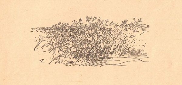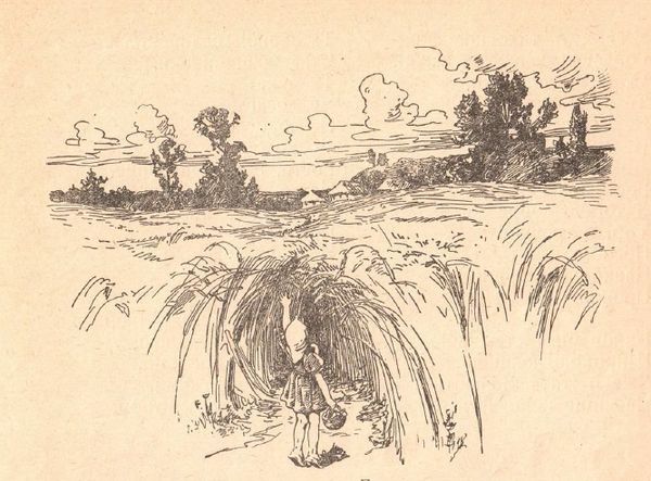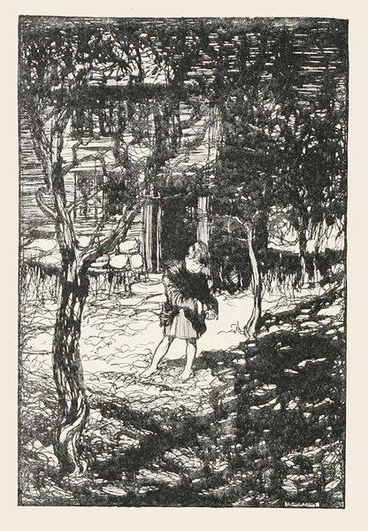 Curator: This illustration, dating back to 1956, is by Hryhorii Havrylenko. Titled 'Illustration for Mikhail Stelmakh's book "In the Hedgehog's Windmill"', it’s crafted using pen and ink. Editor: It’s a charming image. The high-contrast lines create an intriguing texture; almost a shimmering quality to the dense foliage and evokes a feeling of childhood exploration and the magic of discovering a secret world within the forest. Curator: Indeed. The dynamic interplay between the solid black lines and the sparse negative space guides the viewer’s eye, accentuating the form of the young girl. Note how the linework around her figure is more delicate than that of the trees surrounding her; that enhances the sense of depth, drawing her forward within the plane. Editor: I am drawn to the broader cultural context in which Havrylenko operated. Emerging from within Soviet Nonconformist Art circles; his work was inevitably intertwined with broader socio-political dialogues that permeated artistic circles throughout that era. The image encapsulates a certain freedom of expression, offering an unvarnished portrayal of everyday life away from overt political messaging. It highlights personal narratives amidst collective ones. Curator: It speaks to something deeper – this image, though tied to a specific narrative within Stelmakh's book, transcends it. Consider the universal themes: youthful wonder, the human relationship with nature. It embodies narrative art; the drawing beckons the audience into a visual dialogue, hinting at untold stories. Editor: I agree, seeing children represented positively through art offers powerful reinforcement in times of societal pressure. Furthermore, illustrations have an interesting position in history, where artworks reproduced within a book will often become a more economically and physically accessible form. Havrylenko, whether consciously or unconsciously, made his own stand on the accessibility of art and childhood representation. Curator: In its stark monochromatic simplicity, it achieves a remarkable complexity; a microcosm reflecting nature's grand design. Editor: Precisely. It makes me consider art's capacity to function not just as aesthetic adornment, but as an emblem of self-assertion.