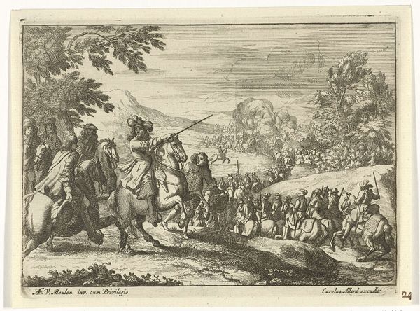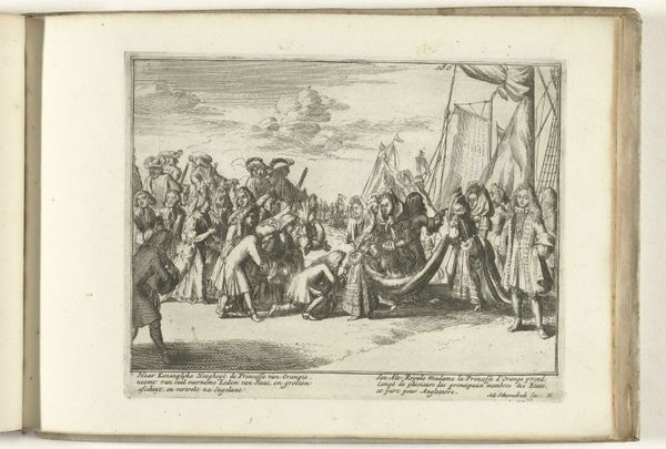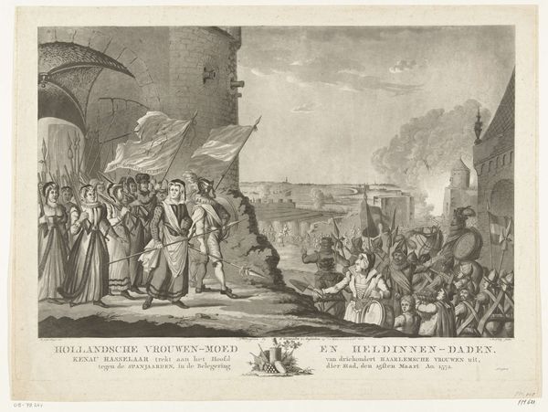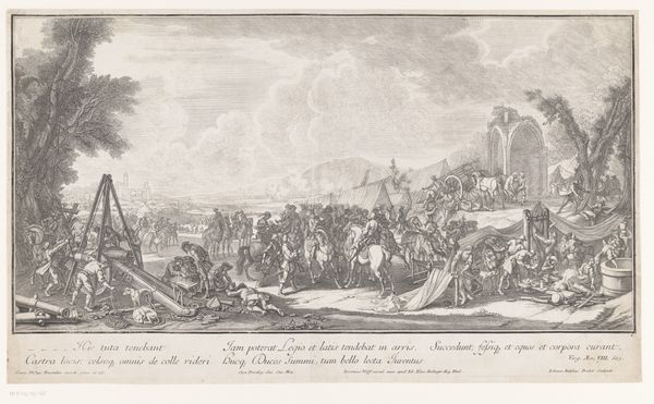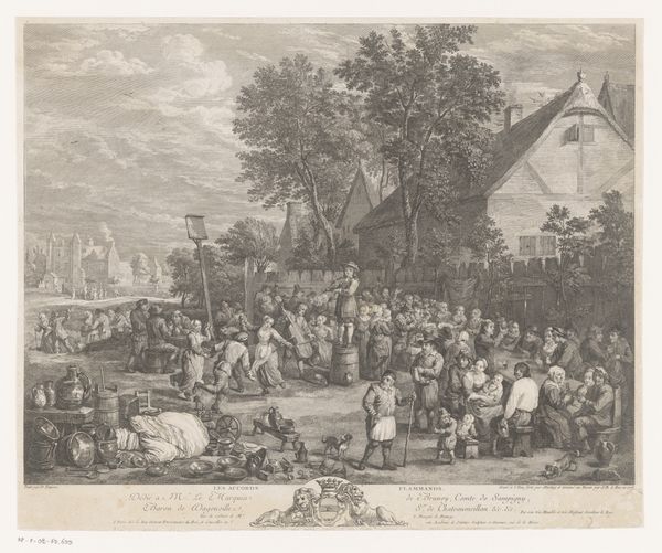 Editor: Here we have "The Idle Prentice Executed at Tyburn," an etching done in 1747 by William Hogarth, residing here at the Minneapolis Institute of Art. It’s such a chaotic composition! My eyes are immediately drawn to the sheer mass of people. What organizing principles do you see operating in this image? Curator: A very astute observation! Consider the composition's meticulous articulation. Note the deployment of line – how Hogarth harnesses hatching and cross-hatching, achieving varied tonal values. It is through these formal means that a sense of depth emerges and one parses this print, element by element. Editor: So, you’re saying the tonal contrasts guide our eye and break down the chaos? Can you give me an example? Curator: Observe how the strong contrast delineating the gallows contrasts with the background sky. This serves to bracket the whole drama and draw our attention toward that distant focal point. Consider too the foreground wall—the use of closely packed parallel lines makes for an area of low interest. What effect does that foreground wall achieve? Editor: I see, it anchors the frenetic scene and pushes our gaze further back, into the mayhem. I was initially overwhelmed, but now I see it is skillfully constructed! Curator: Precisely! Each deliberate choice in line, form, and the arrangement of figures contributes to an emotionally affecting composition. Close looking reveals intention. Editor: Looking at the totality of all its aspects really enriches my understanding. Thanks! Curator: Indeed! Through formal analysis, the artwork transcends mere depiction and becomes a powerful arrangement of forms, lines, and tones which convey a complex experience.
