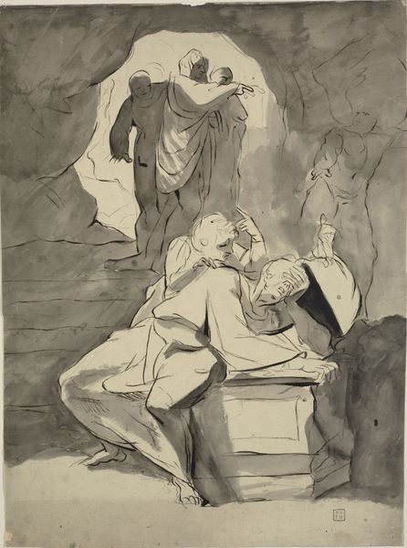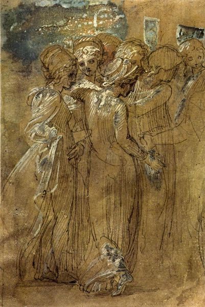 Curator: The watercolor and charcoal drawing “To kvinder paa gaden,” or “Two Women on the Street,” by Constantin Guys, from between 1802 and 1892, presents us with an intriguing slice of street life. Editor: It certainly does have that snapshot quality, doesn’t it? There’s a casualness, a quickness, to the rendering. I notice the lines are quite fluid and confident, almost as if the artist was capturing a fleeting moment, maybe a glimpse into the labor force during those times? Curator: Exactly! And while it appears effortless, there's a considered understanding of social dynamics at play. The women, cloaked and hooded, suggest a need for anonymity. Were they concealing their identities due to societal constraints or perhaps engaging in some form of labor that was not readily accepted or was frowned upon? How were they negotiating public spaces? Editor: It’s interesting to consider the garments and the specific weight and feel they must’ve had on those women during this historical moment. You know, when we analyze garments, we're talking about textiles, the labor that goes into creating textiles, their social circulation. I see these coverings as crucial for understanding the intersection of materiality and daily female existence at the time. Curator: I think you're right to consider materiality; even the monochromatic watercolor wash gives the image a muted, almost melancholic tone, suggestive of the potential hardships that women of the era often faced as they walked the streets. This visual quiet reinforces the reality of their social positioning in that era, both powerful and precarious. Editor: It makes you consider the economic and practical considerations of dress at the time. And looking at how confidently the artist captured this moment of genre painting—there's a level of production we also have to keep in mind, since Constantin Guys made more than 2,200 drawings like these. What was the labor like to create these snapshots in such prolific manner? Curator: Indeed, both the labor depicted within the image and the artistic production required to create it. The layered meanings provide valuable insight, and it serves as a reminder of art’s capacity to encourage meaningful discussion about gender, class, and labor. Editor: Absolutely. Bringing a lens to the methods and social life inherent in a seemingly simple work reveals just how complex and compelling these pieces can be.