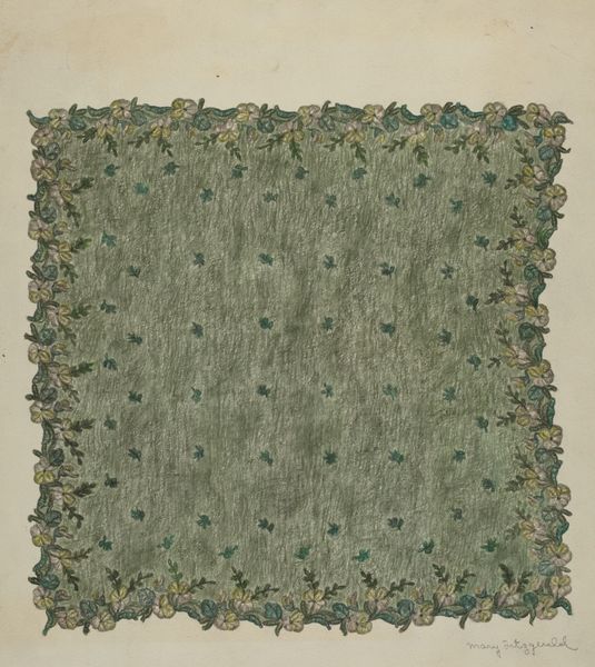 Curator: Immediately, I'm struck by its repetitive nature—like a soothing wallpaper sample from a bygone era. There's a quiet calmness to the ordered botanical motifs. Editor: Today we're considering a "Sheet with overall pattern of leaves and flowers" created sometime between 1800 and 1900, and presently residing at The Met. These sorts of designs reflect intersections of artistic expression, economic structures related to textile manufacturing, and ideas about beauty—especially pertaining to the decorative arts available mostly to women in domestic settings. Curator: Right, and the image immediately sparks considerations of those settings! I see stylized flowers and curving leaves, creating a half-drop pattern. It's incredibly comforting, yet almost…oppressive in its all-over repetition. Is there some inherent commentary on the roles of women perhaps implied in its intended setting within the home? Editor: That’s perceptive! Considering it was designed as a textile pattern, potentially mass-produced, there’s also an inherent tension there, a simultaneous embracing of nature and its industrialized commodification. The botanical imagery softens what would otherwise be rigid geometry. Curator: Exactly. This also gets to the interesting ways nature is read—the layered historical connotations of "floral" versus "botanical", with floral acting to reinforce established hegemonies around "femininity." Who gets to decide what’s simply pretty versus seriously considered? This is where cultural studies proves invaluable. Editor: Absolutely. From an iconographic viewpoint, individual flowers themselves bear diverse associations. A rose represents love or secrecy, while a lily symbolizes purity or resurrection. Do you think, in viewing the repeating pattern of generalized floral shapes, we lose some of that rich individual symbolic weight? Or do we find new meaning? Curator: Potentially. What’s so powerful, in my opinion, is how art such as this can, even unconsciously, be used as forms of resistance to imposed gender norms. Editor: Well, reflecting on this piece helps me think about how symbols become embedded within larger patterns—and how the individual gives way to the collective, the specific yields to the abstract. Curator: And for me, it reiterates how crucial it is to interrogate seemingly innocuous aesthetic choices for their latent social and political implications.