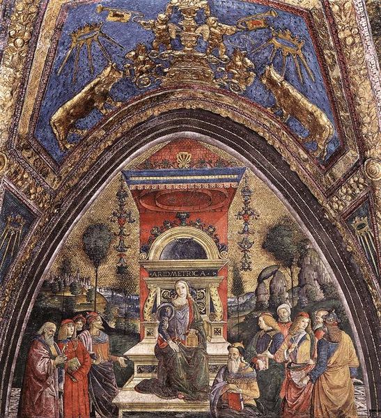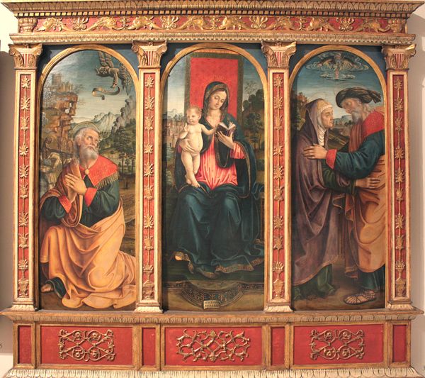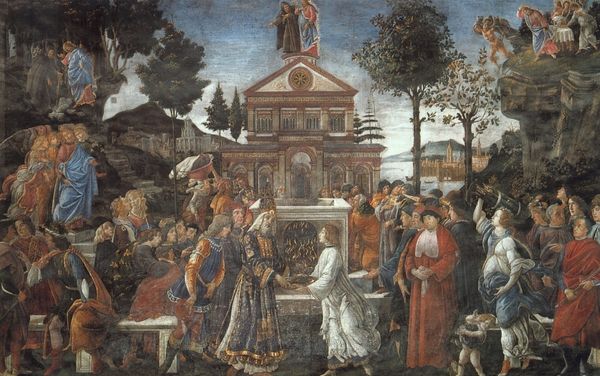 Curator: Ghirlandaio's "Adoration of the Magi," a fresco from 1490 gracing Santa Maria Novella. The narrative feels...well, conventional. What strikes you about it? Editor: It's beautiful, of course! But all those figures, the architecture, the landscape…it's a lot! How do you interpret the choices made in composing such a busy scene, beyond just telling the story? Curator: Let’s think materially. It's a fresco. That means pigment bound directly to wet plaster – labor, time, skill, all intensive and all physical. Consider the status such an elaborate commission signals for both Ghirlandaio and his patrons. Editor: Right, fresco demands a commitment; you can’t just move it around or easily correct mistakes. So, its permanency in public highlights that wealth. Curator: Precisely. And note the integration of landscape. Beyond just backdrop, isn’t it about claiming territory? It all signals power – political and economic, embedded in this act of religious devotion. Editor: So it's not only adoration of Christ, but maybe also quiet celebration of Florence's material wealth enabling the creation and commissioning of such works? Curator: A potent possibility. This opulent materiality doesn't negate spiritual significance, but rather underscores the worldly power intertwining with religious themes during the Renaissance. How does this reading sit with you? Editor: It's certainly thought-provoking to think about frescoes and commissions as material statements of power, alongside their religious meanings. I hadn't considered the labor involved so deeply. Curator: Understanding the material and production sheds light on these complex societal and historical elements present in this magnificent work. Editor: I'll never see frescos the same way again!