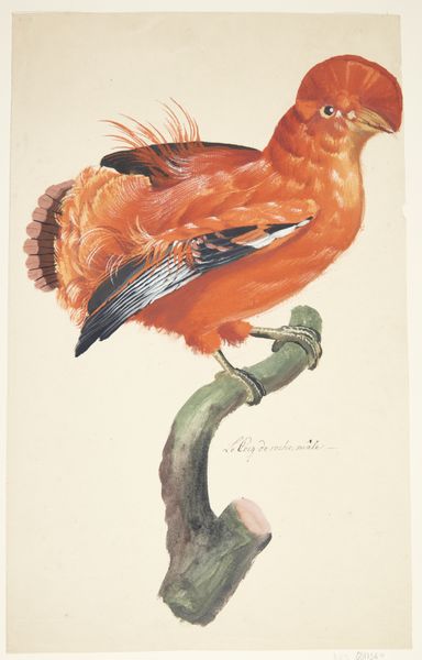 Curator: So, we have here Aert Schouman's "Two Exotic Birds," painted in 1762, using watercolor and coloured pencil— a mixed-media approach. It currently resides here at the Rijksmuseum. Editor: Gosh, they are lovely! I'm struck by the orange bird. It looks so quizzical, as if asking a question with its upward-pointing beak. The smaller, greener bird beside it seems more pensive, as though deep in thought. What an interesting conversation they must be having. Curator: Absolutely! Schouman had an aviary and was prolific in this subject matter. Look at the detail in the larger bird's plumage and its curious head-crest; there is great care in replicating texture, no doubt through layering paint and perhaps a dry-brush technique. Considering this level of craft and access to these avian specimens, one has to consider class and commerce during the mid-18th century. Editor: Right, a luxurious study indeed! The colours, though muted, carry such an intrinsic beauty—the rust and fawn blending seamlessly, evoking the serenity of an untamed natural setting. They make me imagine a balmy island breeze... or a whispered secret shared amidst tropical leaves. Curator: The landscapes in Schouman’s work certainly provide more than mere backdrop, although somewhat indistinct, they do add to a sense of environmentalism and an ecosystem, even on the periphery of the focal point. The method allows us to also question authenticity, what we think of these birds against a somewhat imagined habitat; is the work then an example of invention or of genuine natural history? Editor: Well, it feels wonderfully timeless. Even today, they offer a reminder of the joy to be found simply by looking closely. Perhaps they are indeed "exotic," from a bygone era now, yet somehow deeply familiar. Curator: In light of such reflections, the beauty in examining these kinds of works lies in identifying the methods and origins of their creation; which allow us to question production and provenance further. Editor: Precisely! And isn’t it delightful to get lost in the feathered details, the quietude they invoke?