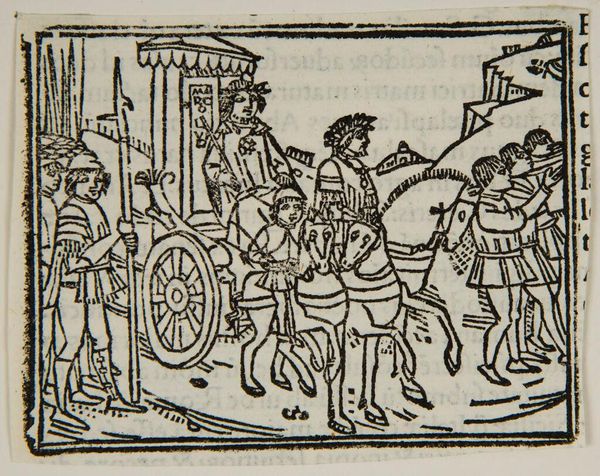 Editor: This woodcut, "Book XXVI.20. Marcus Marcellus has army bear abundance of spoils", by an anonymous artist, depicts soldiers carrying plunder. The linear quality is fascinating. What can you tell me about its materiality and context? Curator: The stark lines, produced through the labor-intensive woodcut process, speak to a broad consumption of images. We see not just a scene of spoils, but also the spoils of accessible knowledge through print. How does this mass production alter our perception of the depicted victory? Editor: That's a thought-provoking point; I never considered how the very creation of the image relates to the theme of abundance. Thanks for this new perspective. Curator: Indeed, examining the means of production gives insight into its cultural value and impact.