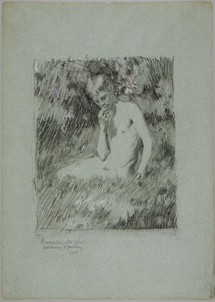 Curator: This is "Standing Bather," a c. 1910 etching by Pierre-Auguste Renoir. Editor: It feels so intimate, almost as if we've stumbled upon a private moment. The soft lines, the way the figure is partially obscured by what looks like reeds… it's sensual, but not overtly so. Curator: Exactly. Let's think about the role of the female nude within Impressionism. Renoir often depicted women in leisurely, natural settings. What narratives are present? This piece comes at a turning point in Renoir’s practice. Editor: I wonder how this piece was received, particularly regarding the male gaze and questions surrounding it. Did it challenge, subvert, or perpetuate then-accepted views? Renoir situates his model comfortably, it suggests female agency. It offers an idea of female form without excessive adornment, a figure situated in nature as nature. Curator: The print medium itself is also telling. It allowed for wider distribution, making art more accessible to a growing middle class and influencing ideas and aesthetic sensibilities within that expanded public. And how did museums, and the art market, play into elevating Renoir, shaping our understanding? Editor: And think about how art schools often presented these works to students as canonical examples of aesthetic value! How do we start untangling and interrogating ideas of ‘universal beauty’ by taking a more nuanced look at their historical context? Curator: It definitely demands further thought. How institutions curate works can subtly shape how the public perceives them. Editor: Definitely food for thought! It's easy to get swept up in the aesthetic of something like this, but stepping back and engaging in its social and political context adds crucial layers.