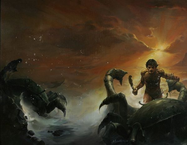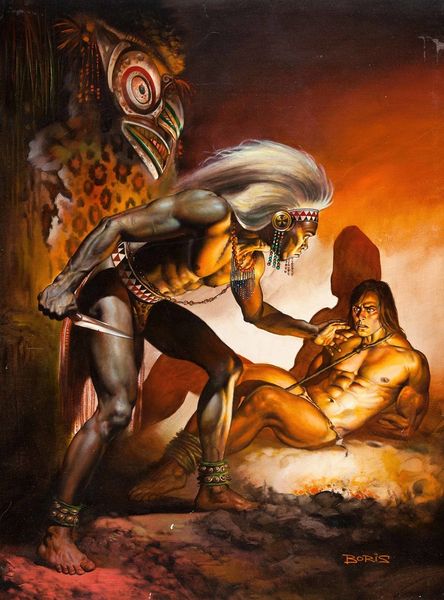 Ken Kelly made "Chamber of Illusions", and I think he made it as a painting. Look at how Kelly builds this space with color, moving from hot oranges and reds to cooler blues and greens. It feels like he's layering emotional temperatures. You can almost feel the brushstrokes, they’re not trying to hide. I love the way the light catches on the orb in the center. It's almost like a little sun, casting its glow on everything around it. And the way the figures are rendered, with such strong lines and dramatic shadows, reminds me a bit of comic books. This piece feels like a conversation with earlier illustrators like Frank Frazetta, but with Kelly's own sense of drama. It's about capturing a moment, but also about creating a whole world of feeling. The details are kind of like thoughts, they're always changing as you look.