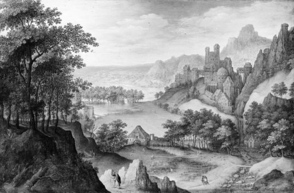Editor: Here we have Thorald Læssøe's "View from Tycho Brahe's Observatory in Prague," created sometime between 1831 and 1878. It seems to be rendered in painting, possibly en plein air. It feels very structured, almost architectural, with a clear division between foreground and background. What do you see in this piece? Curator: Its architectonic structure certainly invites consideration. Note how the formal elements conspire to generate depth. The receding planes of the courtyard, anchored by the strong verticals of the colonnade, pull the viewer's eye through the pictorial space, finally resolving on the distant city. Do you observe how the composition guides us? Editor: Yes, it’s like the painting has been meticulously designed as an image: how are we supposed to understand Læssøe’s composition beyond the technical mastery and clear staging of the painting’s architectural elements? Curator: A close look reveals how Læssøe orchestrates light and shadow to create texture and volume. Observe the meticulous detailing in the rendering of the stonework and the nuanced gradations that articulate the forms. Consider the overall tonal range, primarily subdued and desaturated to enhance form rather than illusion. Do you perceive the significance of Læssøe favoring geometrical articulation to depict the natural landscape? Editor: Yes, absolutely. The artist opted for restraint; the absence of vibrant colors amplifies the structural integrity, allowing viewers to closely study textures. What you've noticed about this interplay truly underscores how light orchestrates both detail and space. Thanks so much! Curator: Indeed, contemplating its compositional elements enhances our appreciation of the artwork's aesthetic depth, thereby underscoring Læssøe's command of form and the formal structures creating its distinctive identity.